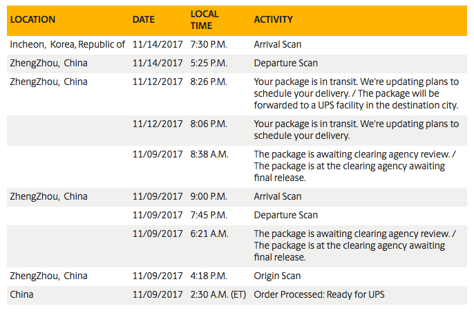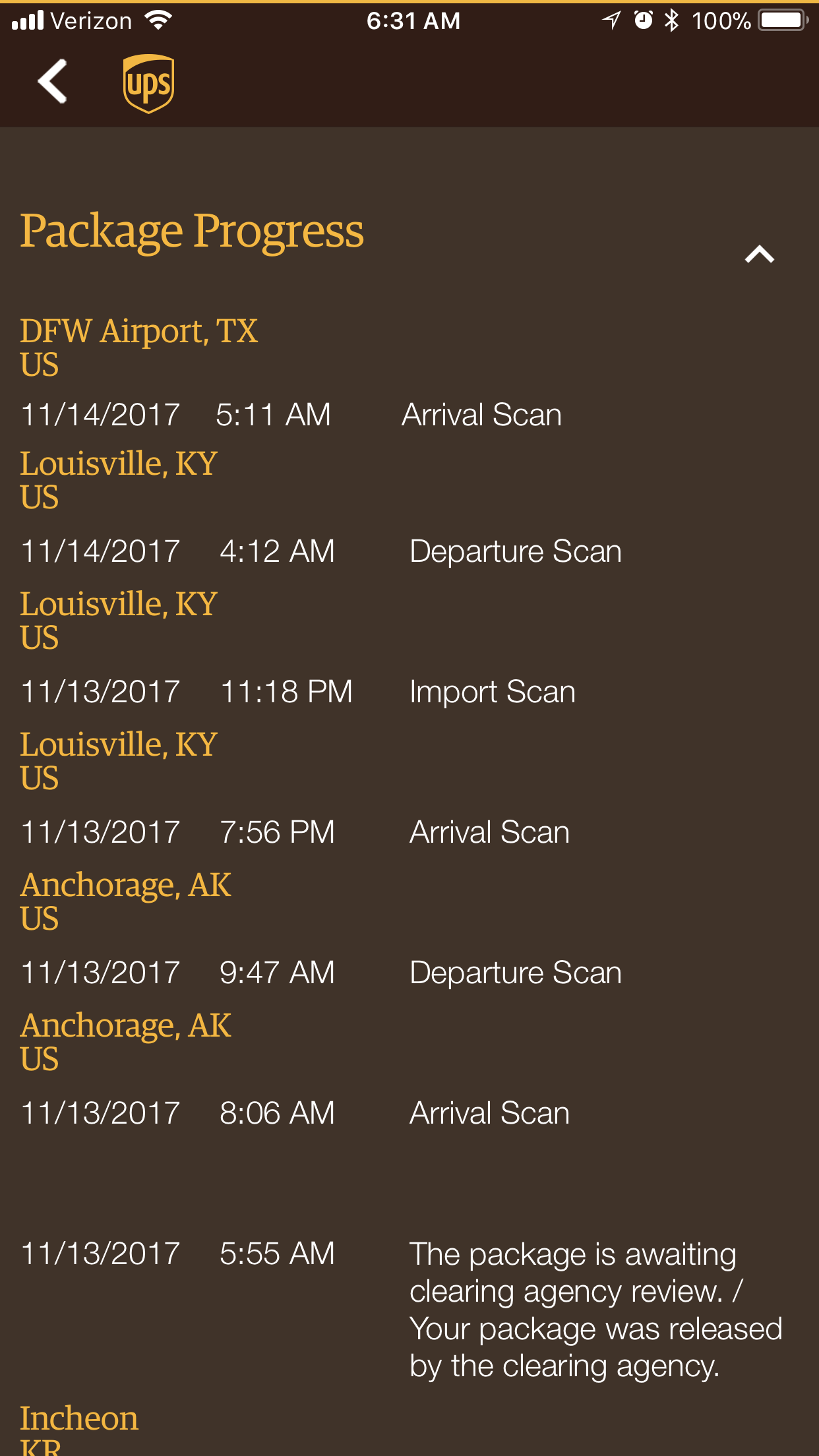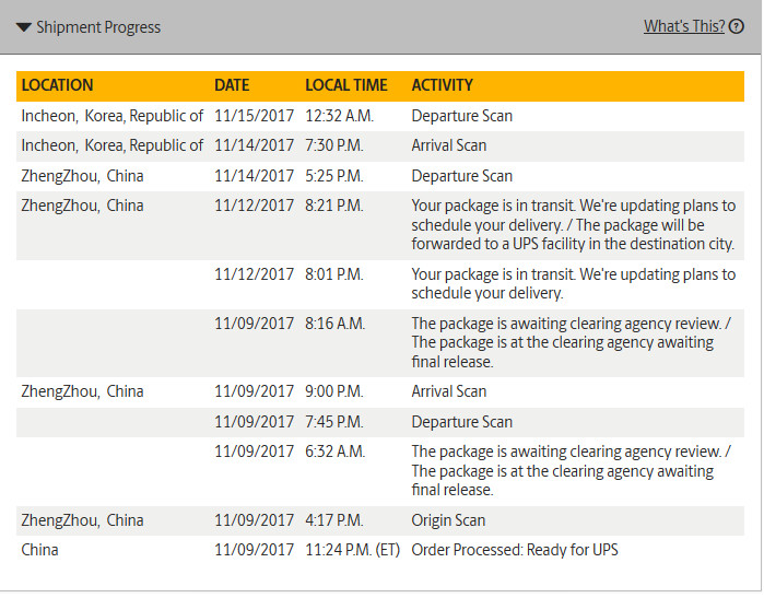 Originally supposed to be 13th. Then after sitting in Korea for 5 days it changed to 16th. Finally started moving yesterday morning and Made it from Korea to DFW in about 24 hours. So yes it beat my UPS estimate by 2 days, but it took a total of 7 days on shipping. 11/7 to 11/14. I’ve posted my shipping details below.