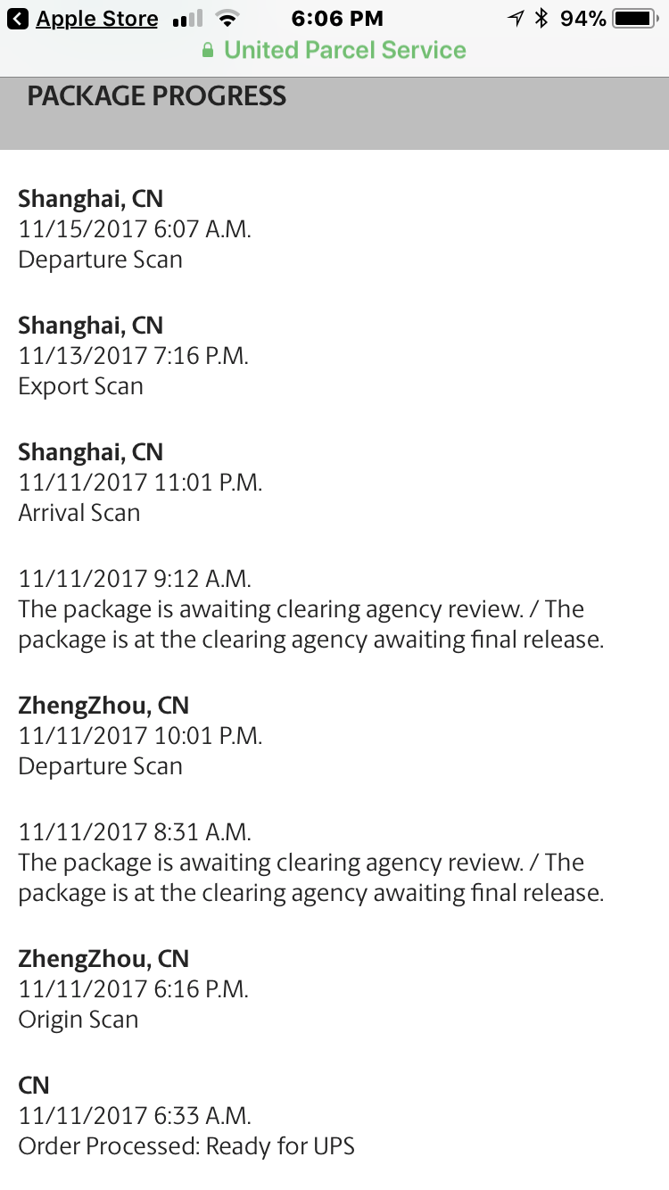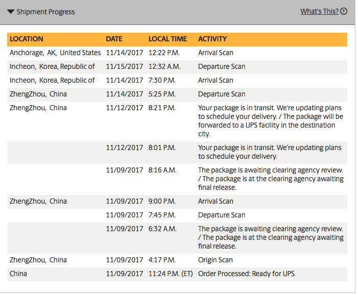 China 10/11/2017 6:15 (ET) Order Processed: Ready for UPS
