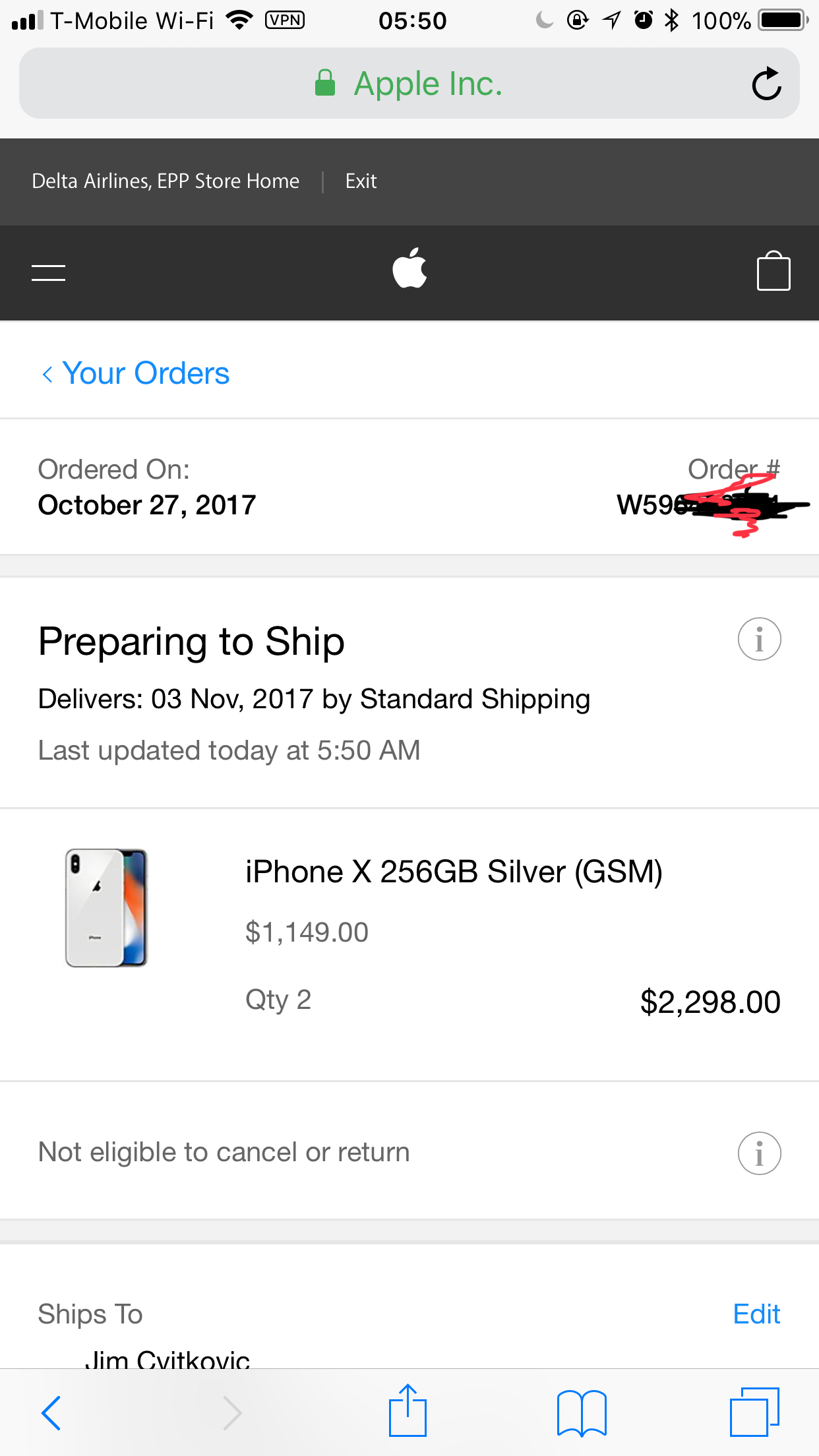 Hi, I placed my order for the 256GB Space Grey iPhone X, I received the mail with no problem, but I am starting to fear something is wrong. My issue is the following, if I press the link with the order number on the confirmation email it shows me the info with no problem and a Delivery date of 17 - 24 nov, but it's strange that if I login on apple.com to my account and go to the orders page, it tells me there's an error and I can't see the info (Pic attached)