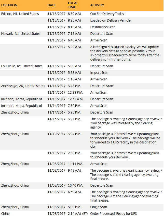 I know many of you are in disbelief that it has the potential to get to you the next day even if it's in Korea, but for me personally, my phone in the span of about 24hrs went from China, to Korea, to Anchorage, to Louisville, to Newark, NJ, and is being delivered today. My original UPS estimate was yesterday, but that estimate was removed early on in the shipping process while it was stuck in china and didn't get updated until it got on the truck to be delivered today. Apple said it would be delivered on Friday. Now that its on the truck, UPS said it was supposed to be delivered tomorrow, but has been moved up to today.