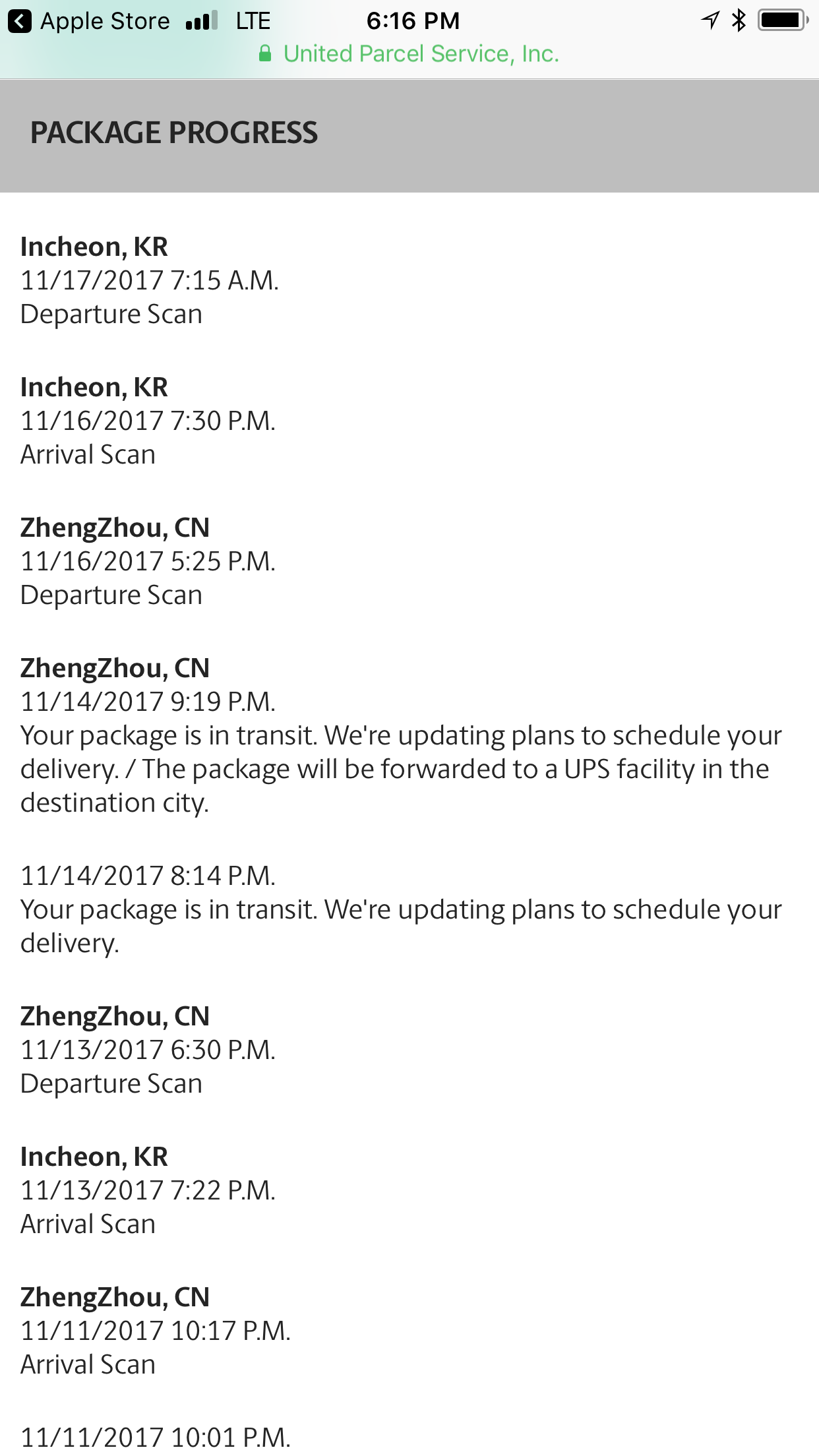 BTW, I did not have a delivery date basically all the way from 11/10 to 11/16. It was originally 11/15, but then disappeared once I got my first "agency clearance" scan. It was not until it was out for delivery today that they finally updated my delivery date. I was in the dark all the way until then.Does anyone who just had their phone out of Incheon still not have a delivery date?