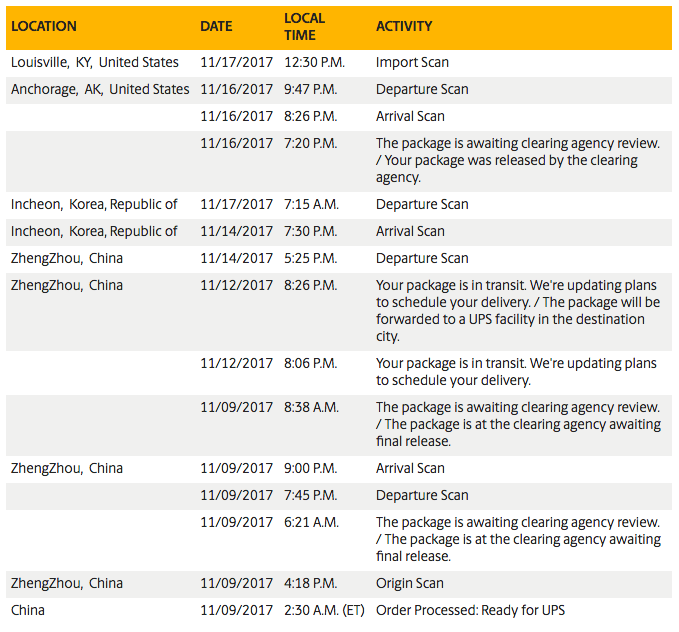 If that's not the case, then I really have no clue how UPS logistics works. I just don't understand how something can ship 10 days ago still isn't at the destination. This is borderline slower than buying some copyright-infringing knockoff product off Amazon that's made in China.