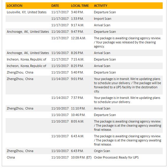 11/18/2017 12:01 A.M. The package is awaiting clearing agency review. / Your package was released by the clearing agency.