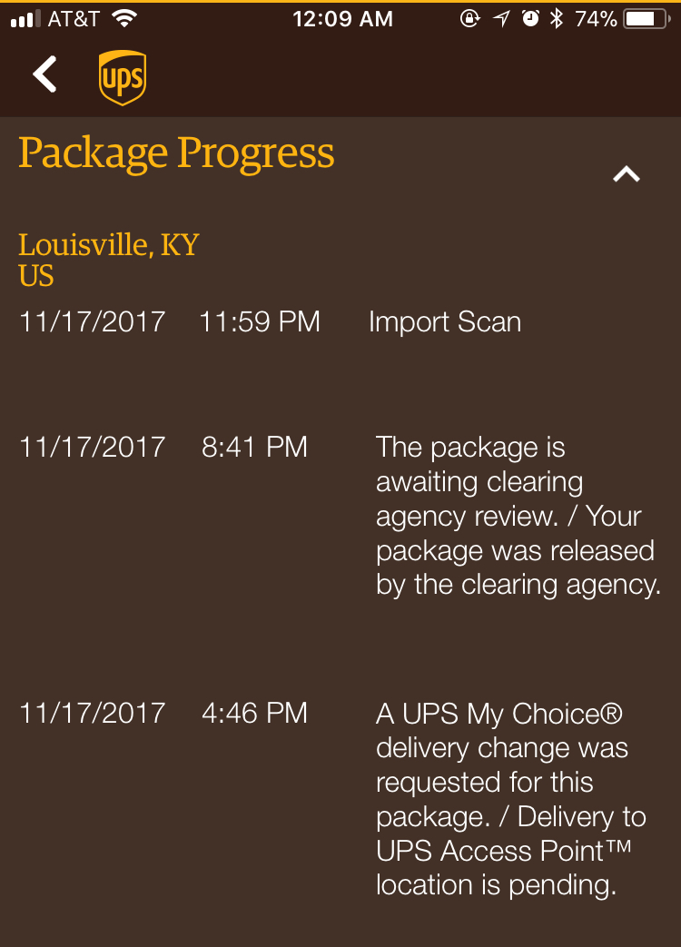 Glad you got the import scan! I’m in Los Angeles and my delivery date was moved back to 11/21. They’re not going to be rushing to push my phone out of Louisville this weekend.Yes, when you get to Louisville you have to go through customs again. I am in the same boat, I have landed somewhere (UPS website does not say where I am) and I have no import scan, however, I do have a departure scan from ANC and now my status is showing that my package was released by the clearing agency. I was hoping to get out of Louisville tonight because then there would have been a chance of getting my phone today, but now it is highly doubtful. My only hope is that they are behind on scans and it will catch up in the system.