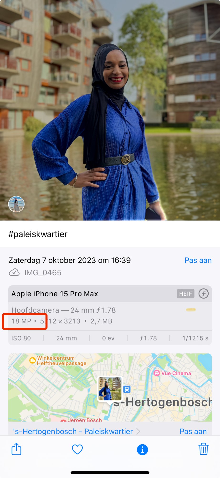 Press the info button under the photoI'm experimenting with the different file options in my 15P. After shooting, how do I find out the MP number for a photo in the Photos app?