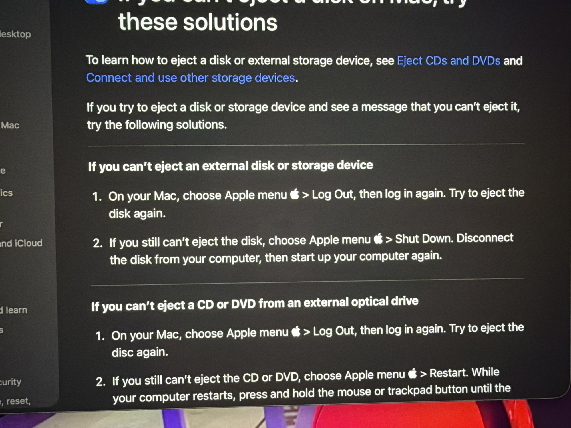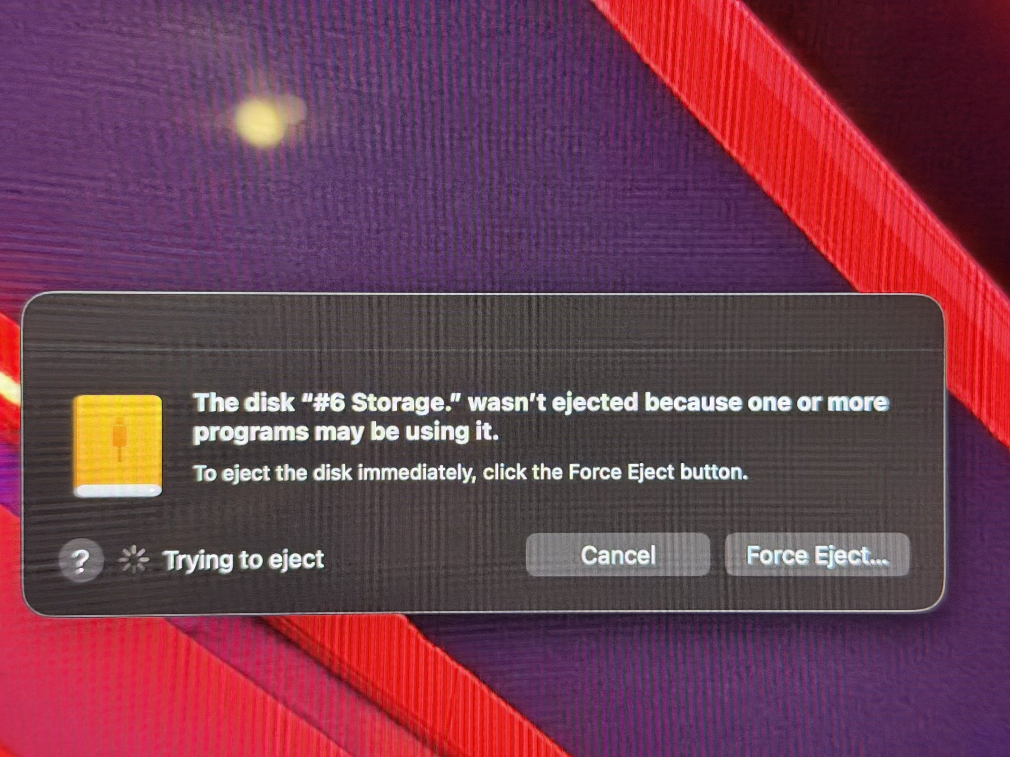 Hello. I just airdropped a bunch of photos and videos from a trip on to my Mac. I put them on my new Samsung external hard drive and now it won’t eject. I’ve never had this problem and I’ve had this external hard drive for about four or five months now. When I clicked the question mark on the pop-up, it took me into an apple help window. I followed the first instructions and logged out and logged back in, but I still cannot eject. Quick Finder isn’t running or Preview. I thought maybe because I looked at a video and some pictures that that could be the issue, but it’s not. Should I follow the second set of instructions and shut down my Mac and then unplug the external hard drive? You can see the pop-up I’m getting and the instructions I got when I clicked the question in the pop-up in the pictures. Thank you!