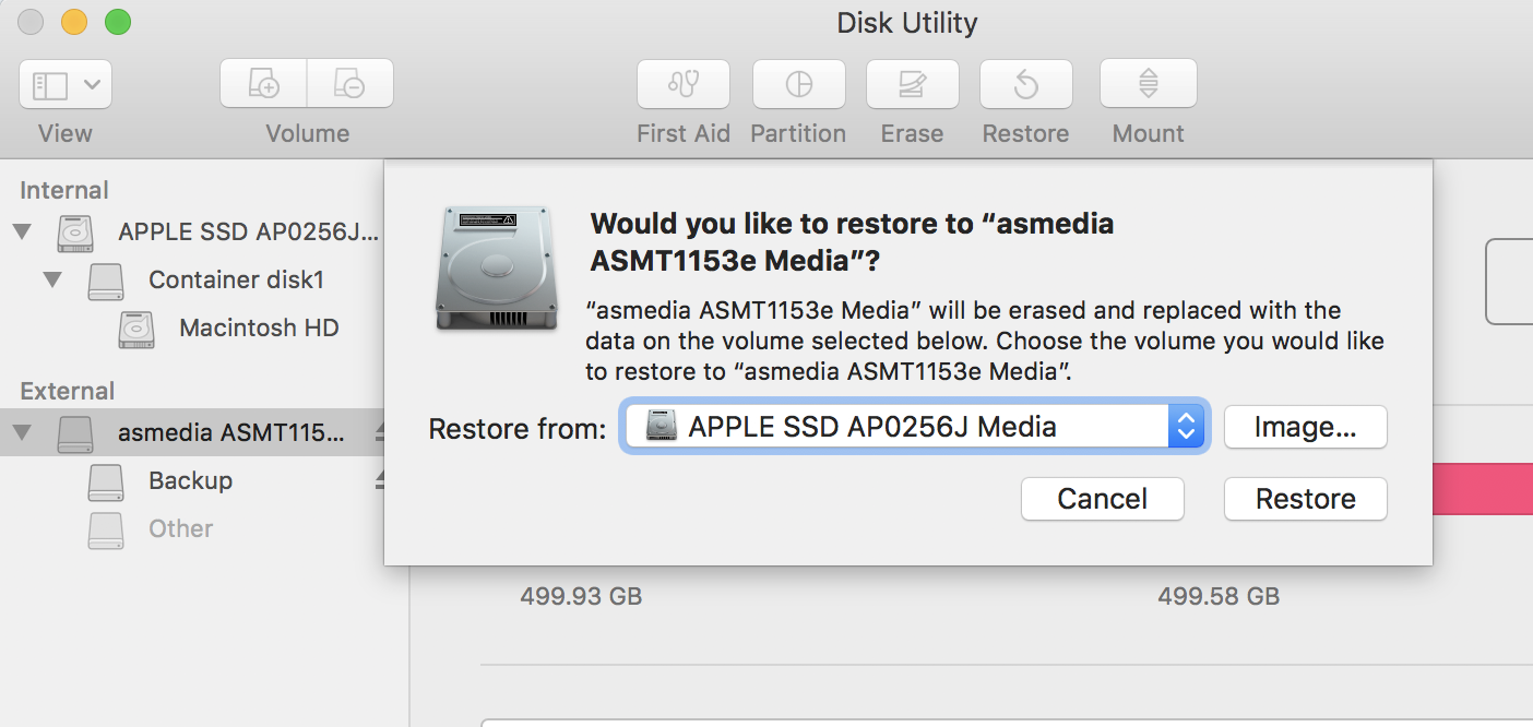 Then select the external like in my screenshot and click the Restore button. Then in the dropdown select then internal drive and click restore. That will essentially clone the internal to the external drive.