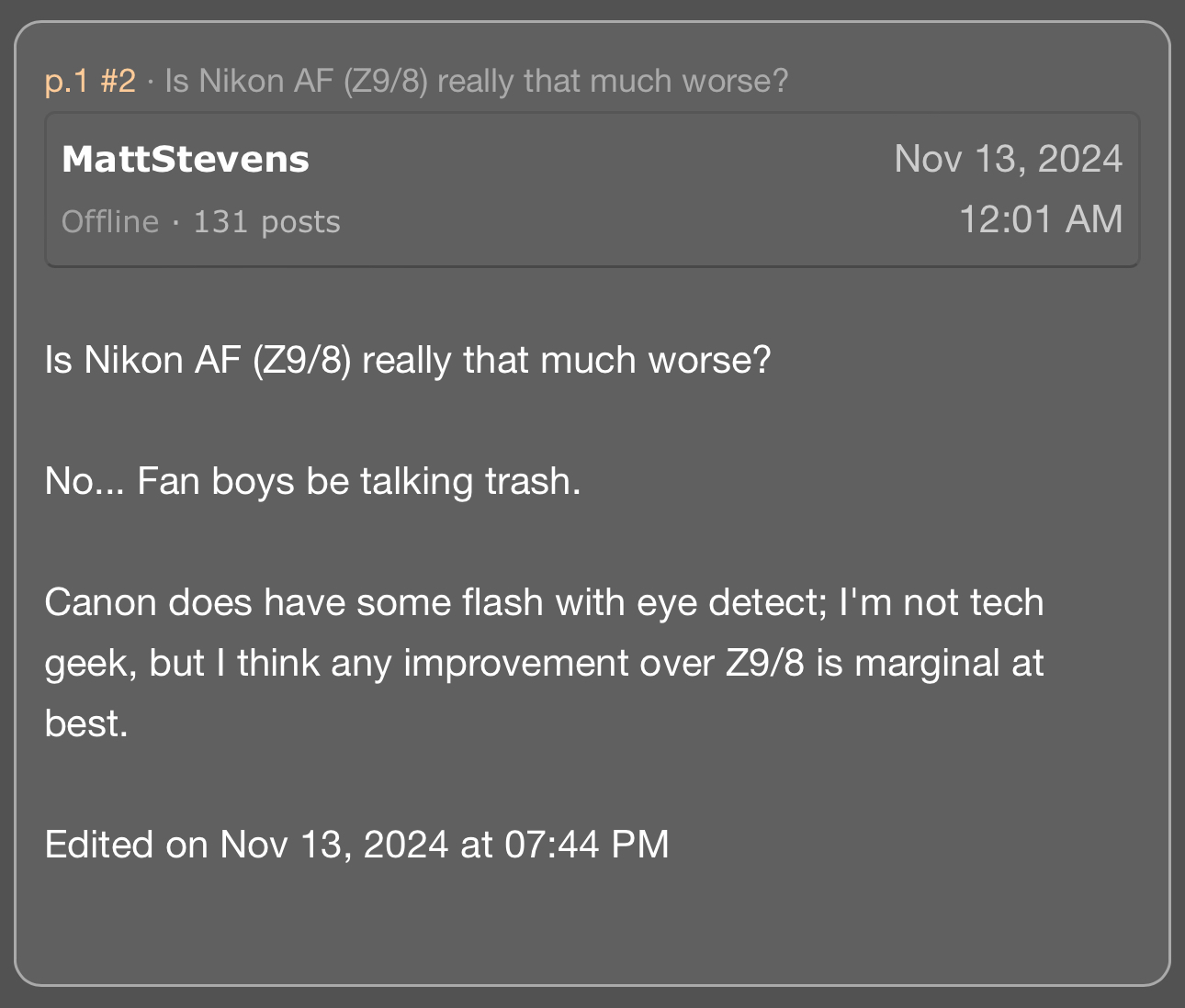 Your mention of Zebras reminds me that, yes, Sony makes it quite simple and convenient to use this method as one way of monitoring and nailing correct exposure..... I was surprised rather a while ago when in another forum I kept referring to using Zebras and the people on that forum obviously didn't get what I was talking about. We all muddled around for a bit trying to figure out what was causing our apparent lack of communication until finally at last things became clear. There was good reason for that confusion. At least back then (and possibly still now, I don't really know) Nikon did not utilize the Zebras thing, or or if they did it certainly was a mystery to many Nikon Z series users and apparently wasn't nearly as convenient as it is with Sony. I don't know about Canon's approach to this.The A1ii is twice the price of the A7RV here. Even when I bought the A7RV the A1 was a lot more expensive and the A7RV had some advantages. I got a lens for the difference in price. Anyway, I don't really need the speed of the A1.