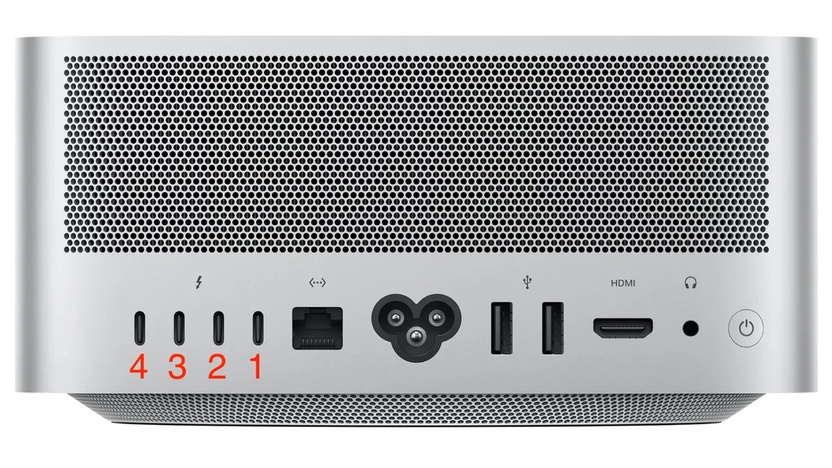 (Note: the System Information app calls these thunderbolt ports “receptacles”. Receptacle 1, also Thunderbolt/USB4 Bus 0, is the one closest to the ethernet port, and receptacle 4, Bus 3, is the one closest to the side of the computer. It’s a bit confusing, but basically if you look at the Mac Studio from the back, left to right is receptacles 4 to 1.)