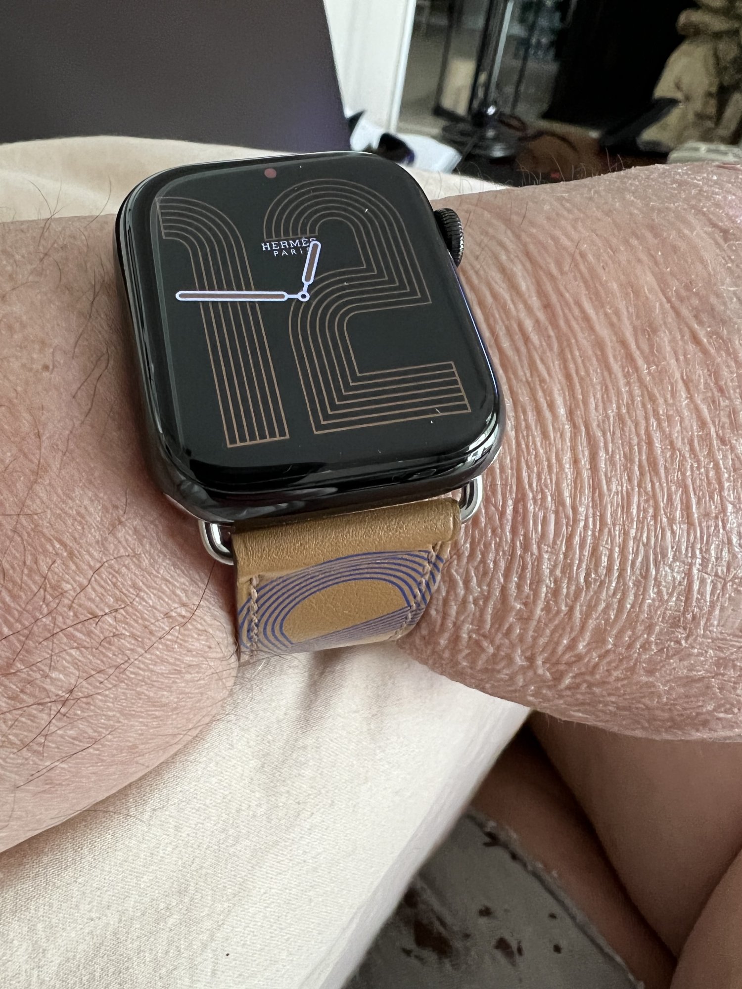This is favorite color for the new Hermes bands and one of the more unique offerings. I almost wish Hermes offered it without the design as well.Felt like a Biscuit today ….love how the screen changes to black with Biscuit colored number.