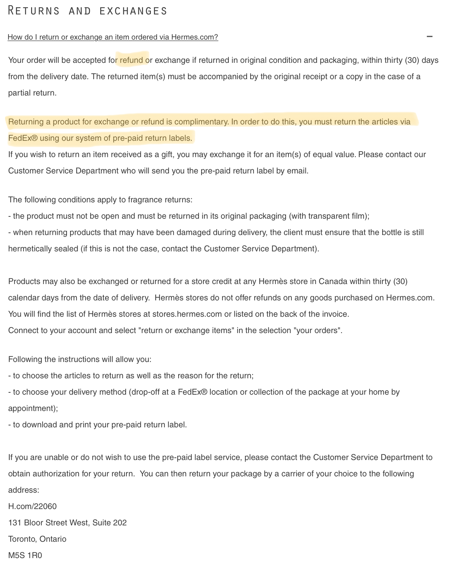 I think if you buy at a Hermès store you can't return or at best you'll get store credit. With their website their policy could be different, so there's that to consider.