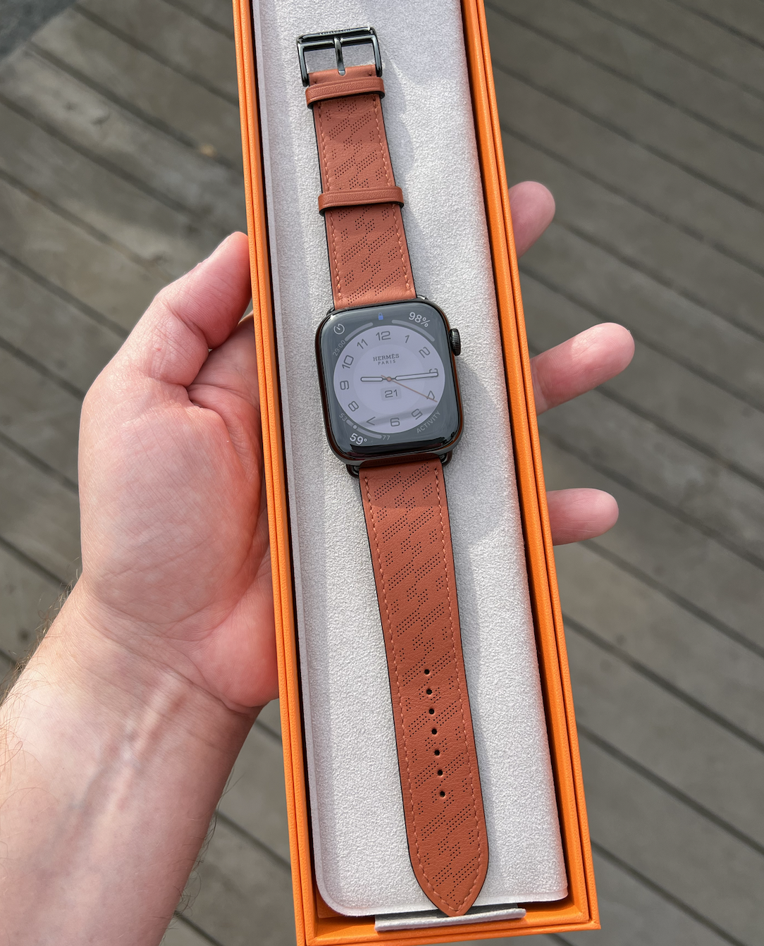 I’m lucky to have this band. There’s also a gold pin one out there. And let me say the SBTi pic is def some funky lighting. It was either a smoky sky or like rain clouds with the sun. GorgeousI think the Hermes Orange will look fantastic with the Space Black and as you can see above with the pic it 100% looks great.