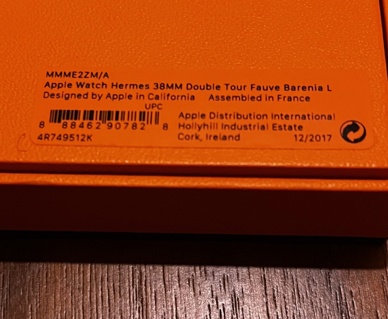 I've picked up a couple of double tour bands since then, I really like the unique look they have. I just received a Fauve Barenia double tour I purchased from eBay. It came in the retail Hermès box, and appears to be genuine except for the fact it's longer than my other double tour bands, and both sides of the band are stamped with an "L" before the 38mm marking. I also just noticed the label on the box has "L" at the end.