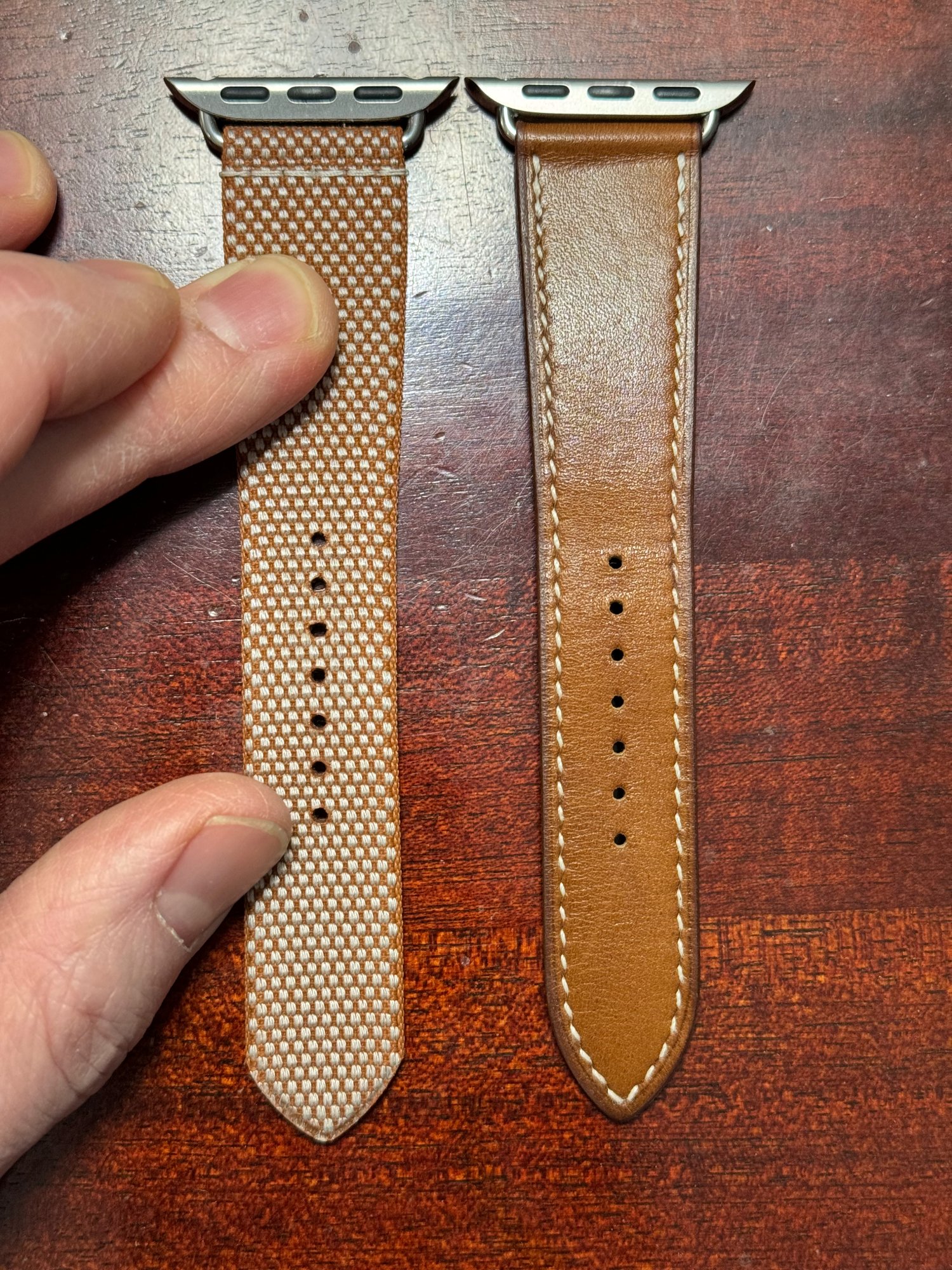It’s not nylon vs leather. In the last year or two the hole positions changed on the swift bands (not sure if it did on other leathers) so some of my older swifts fit better than the newer ones. Like my ideal size is between holes.After criticizing the Swift leather and saying I would be interested in the Fauve if only I could find a new one...I did, on eBay. Not NIB, but very definitely genuine to my eye, the only "wear" I can see is a try-on crease on the near hole and darkening from the amount of time that's passed. Happy to get this since it appears from my research the last time it was offered in the smaller size was Series 6 - back in 2020.