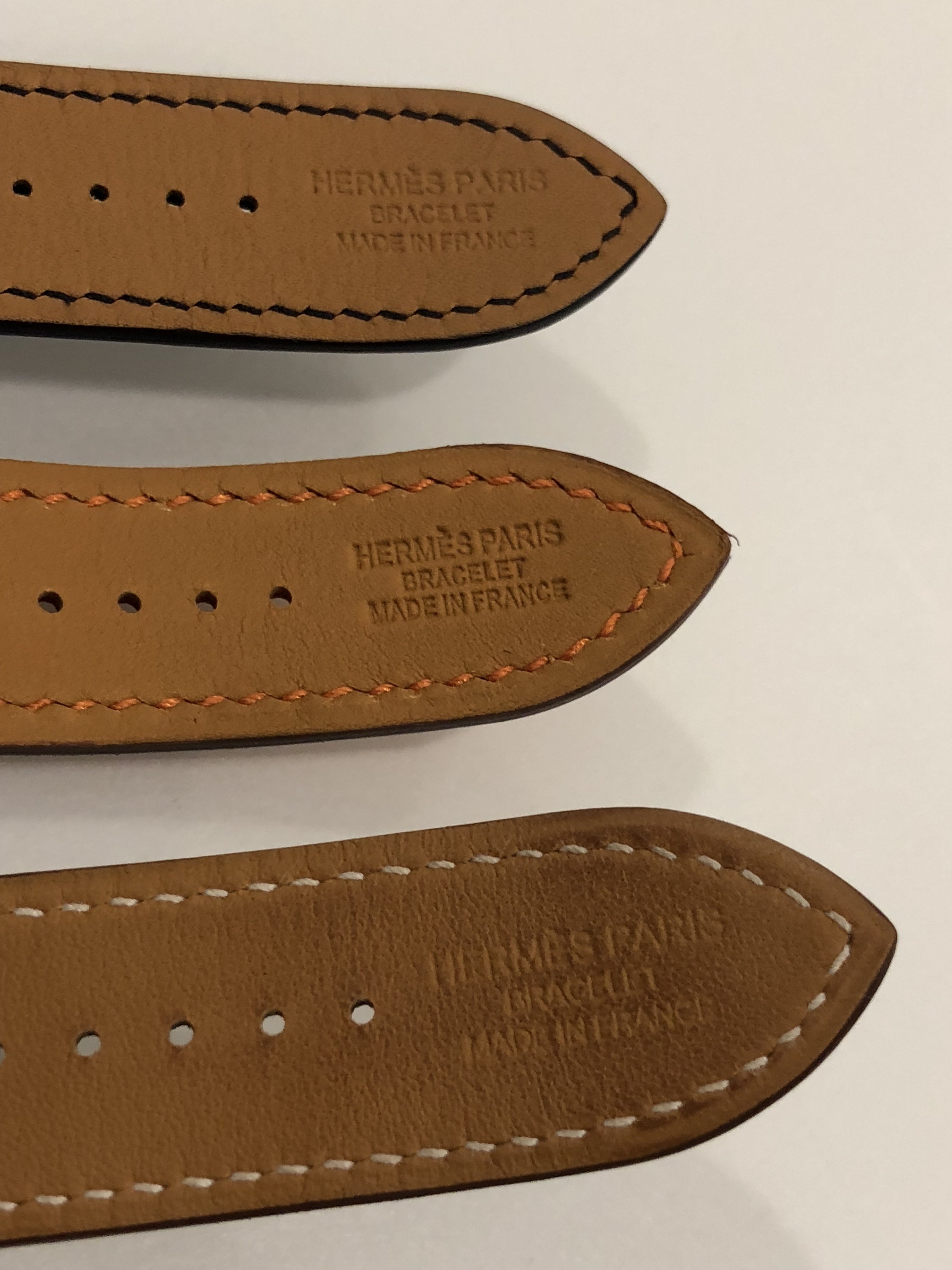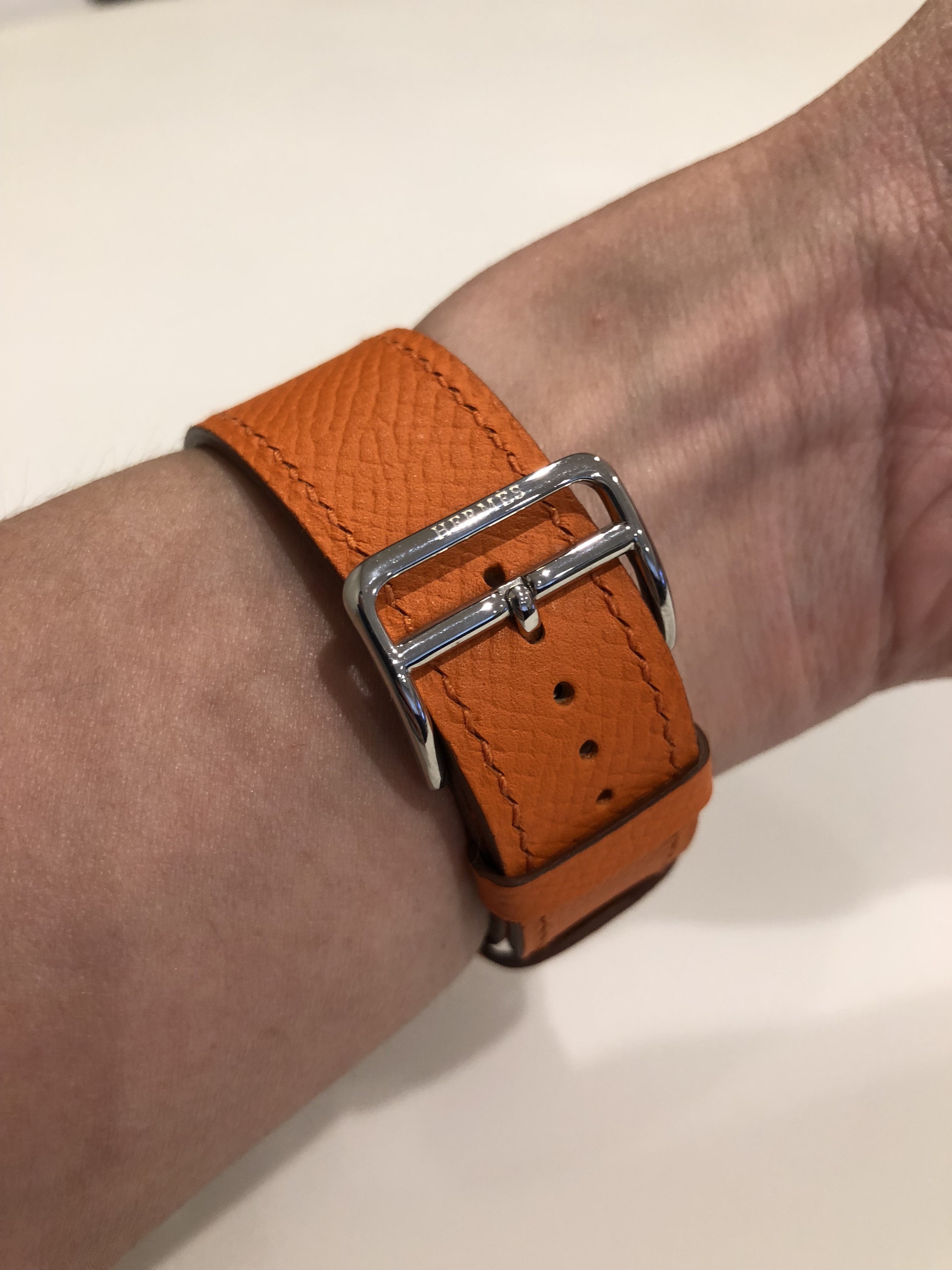 Buckle: There is engraving of Hermès on the buckle, but the fonts are smaller, and the indents are shallower than the genuine one. The actual buckle is also thinner. However, the latch which passes through the hole in the band is not as sturdy and can be twisted from side to side.