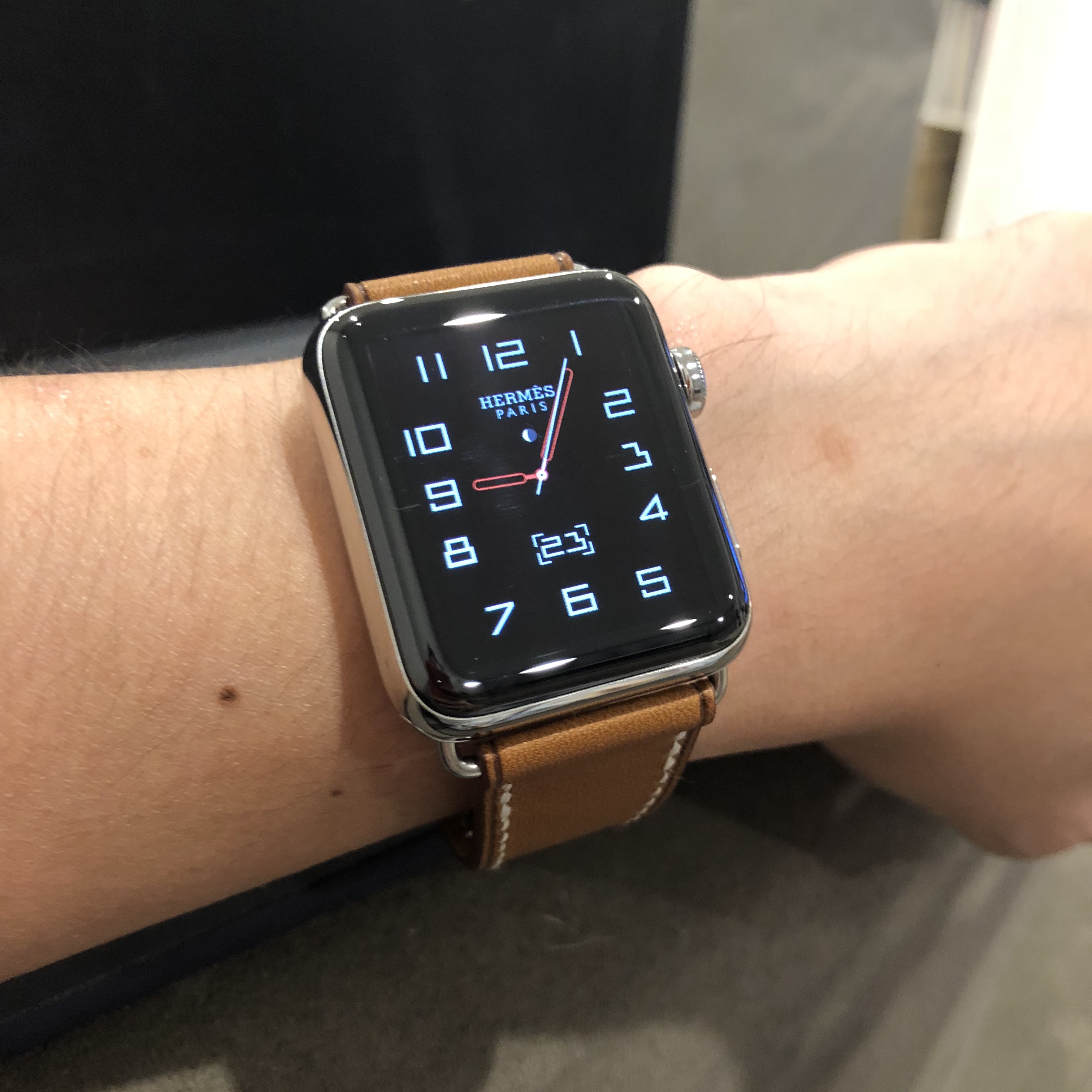 I’m on business in San Francisco and the Apple Store in Union Square had the Hermès Single Tour in stock and I bought it. She told me Apple usually would honor a return last 30 days but she couldn’t guarantee it. I might just give it to my wife when I get back on Friday from my trip as an early Mother’s Day gift. Apple was able to give me the Hermès bag as well.