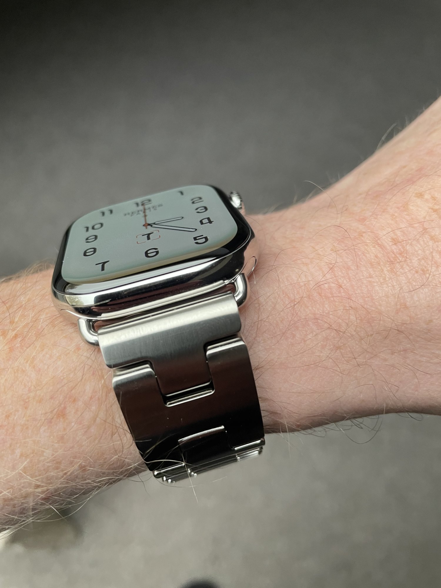 Y’all are all into the hype of this new, first ever link bracelet from Hermès. Anyone have a stainless steel from earlier series’s and put this band on their Apple Watch? Also on gold stainless steel.Wow, that was quick! Ordered my Grand H Satiné band (46 mm, large) on Nov 1st, got it today, six days later. Love it!