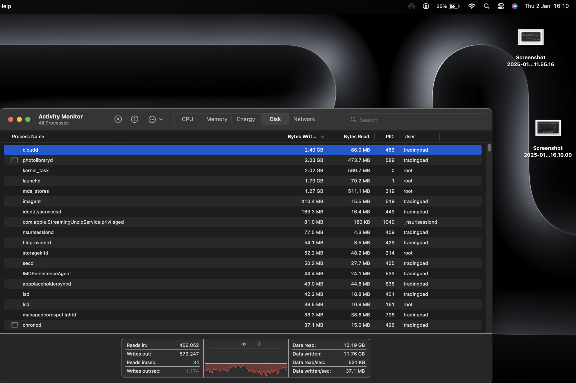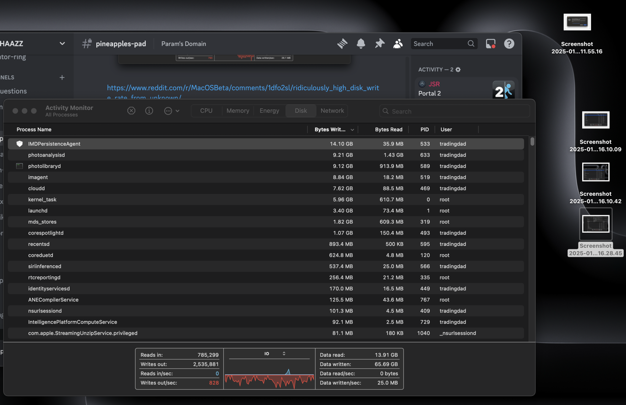 I will attach a photo of the Activity Monitor showing the tasks writing the most data, i am going to stop imessage syncing now to see if that helps as iv read this IMDPersistanceAgent can be related to imessage. Theres not much online about this issue at all and even less for more modern M chip Macs.