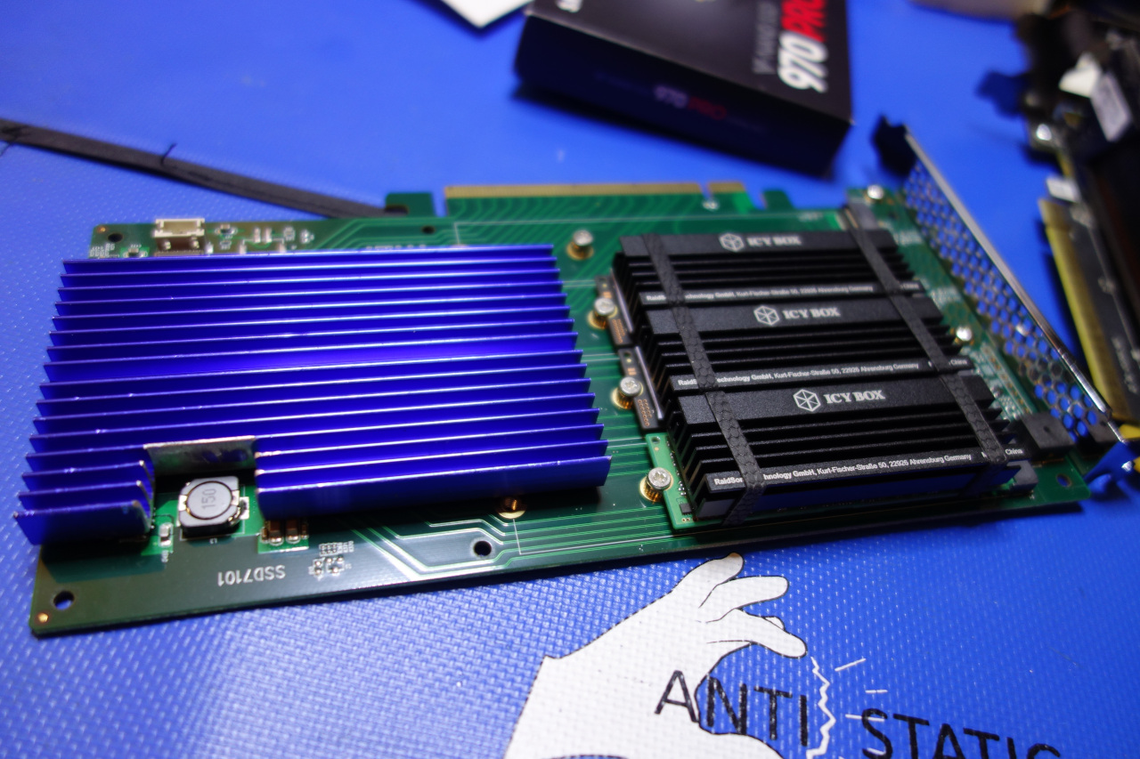 More or less a year ago I added a 4th SSD: the complete configuration since is 1x 970Pro (512 GB) for System/Boot and 3x 970Evo(1TB) as raid 0.