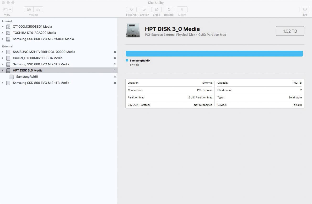 I think you can. If the ssd7100 series RAID works anything like my HPT RS6124v then the HPT GUI programs the hardware RAID controller rather than physical switches. All my enclosures that have hardware RAID appear to the OS as one physical drive so essentially the OS don't know it's RAID. Have we tried booting an APFS volume via hardware RAID?Interesting, I don't understand how the drives are merged as macOS sees just only drive. I'll test this with my SSD7101-A to see if I can do the same.