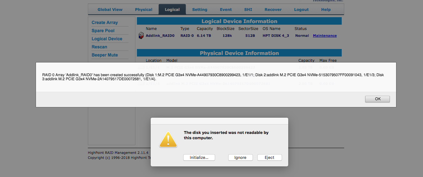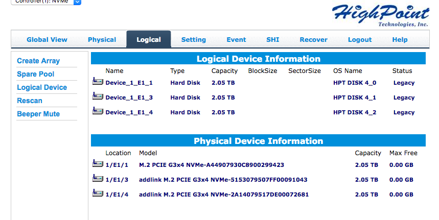 One thing to learn from the output is that the IOUserClientClass "RSNVMeControllerClient" attached to the RS7101Controller shows that "raidman-httpsd" is the name of a daemon (the name ends with a "d") that talks to the controller. http probably means it's web based. raidman is probably short for RAID Manager. You already know that there's a Web based RAID Manager but now we know that it talks to the RS7101Controller using a UserClient interface from a process named "raidman-httpsd".