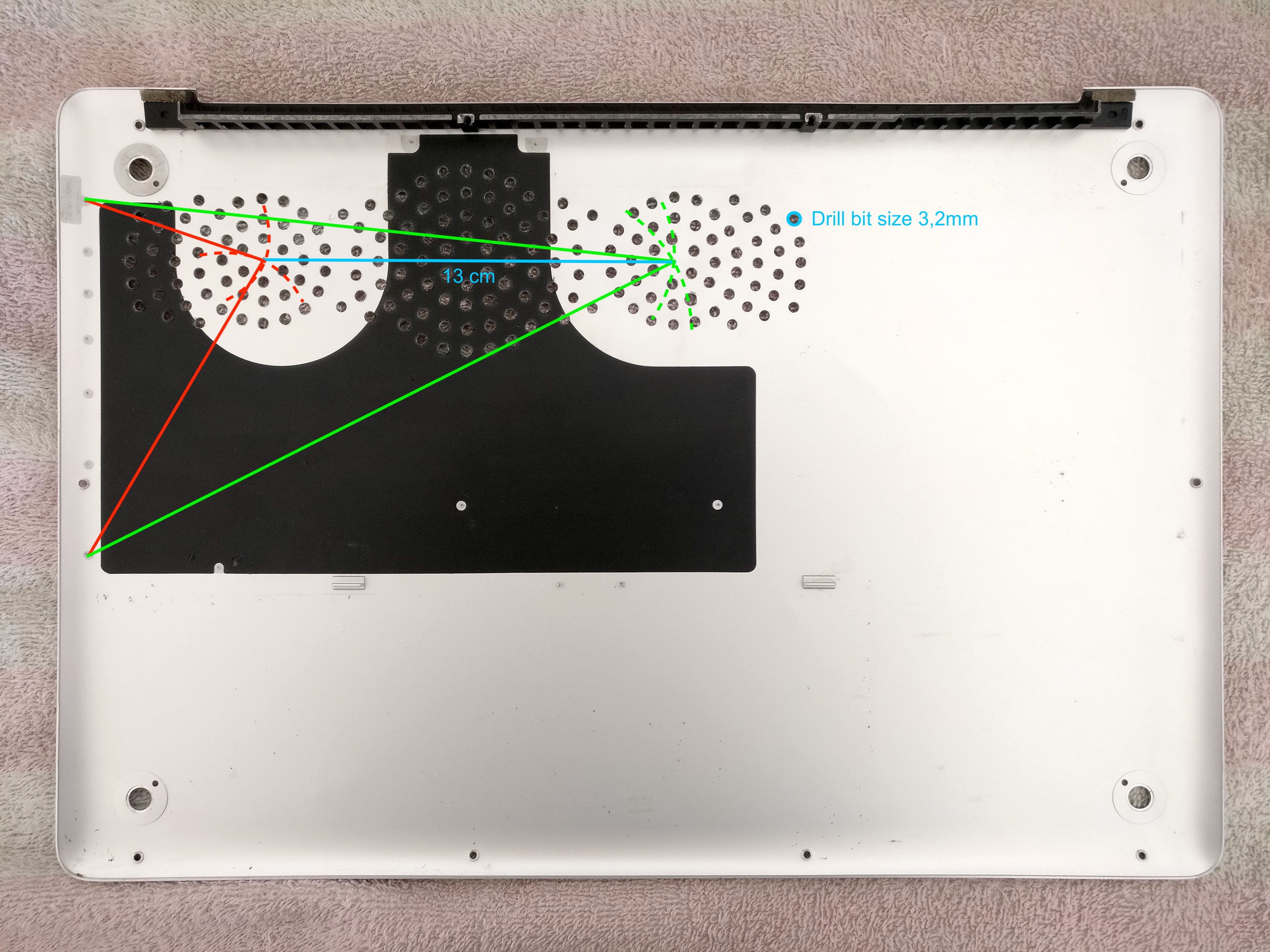 I bought a spare bottom case to drill some holes to better feed cool air into the fans. It's easy to find the center of the fans on the bottom case with the help of geometry. You can take the mesures directly on the mobo with a compass between the pogo pins and the centre of the fans. Then report the mesures with the compass in order to build a triangle from the marks left by the pogo pins on the bottom case. I uploaded the holes template as well.