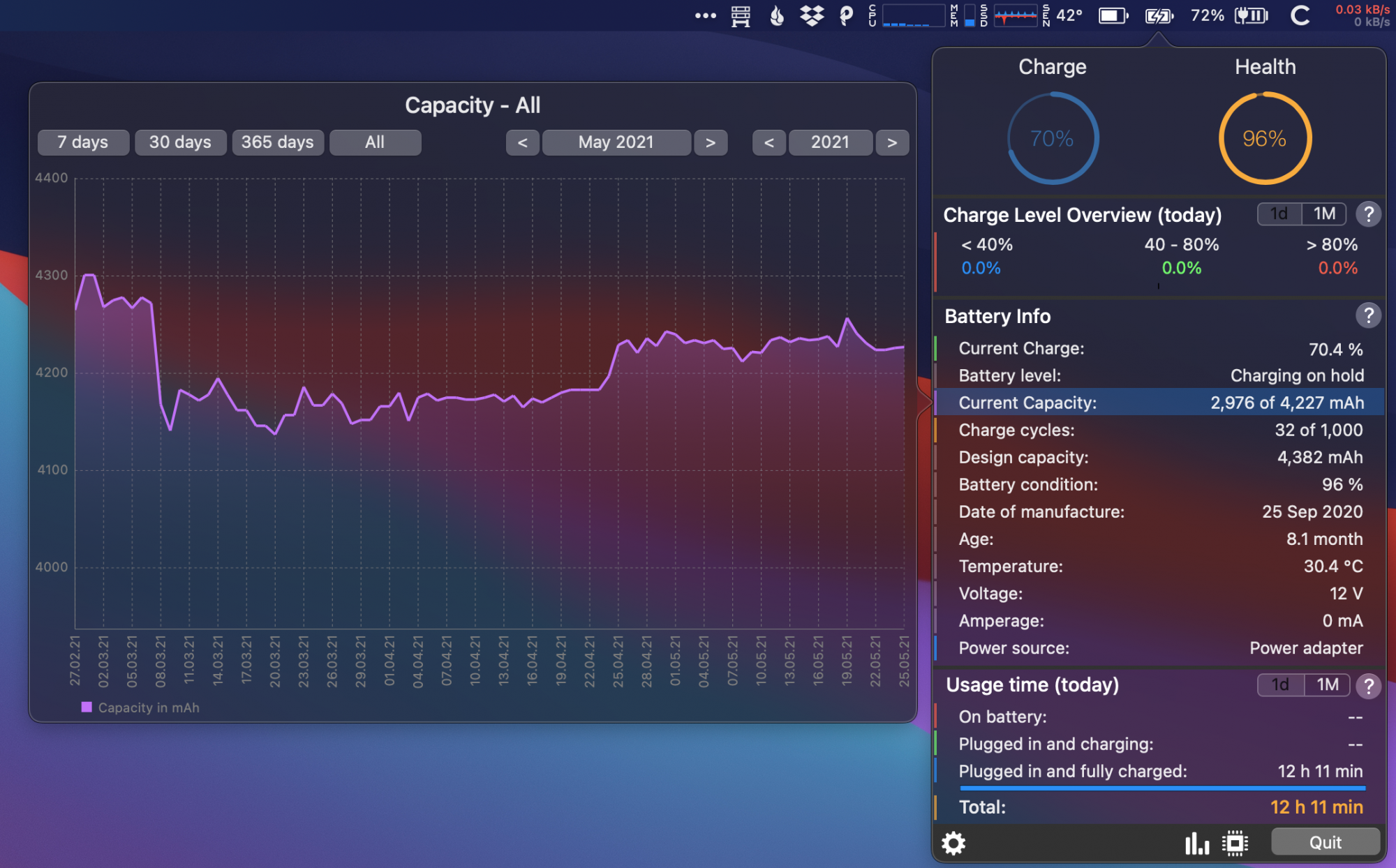 So I was using my laptop in clamshell mode, and I have to take it out of clamshell mode and unplug it to let the battery go below 75 percent, and then I will plug it back in and turn on the Aldente free version. Hopefully, it limits the battery to not charge above 75%.