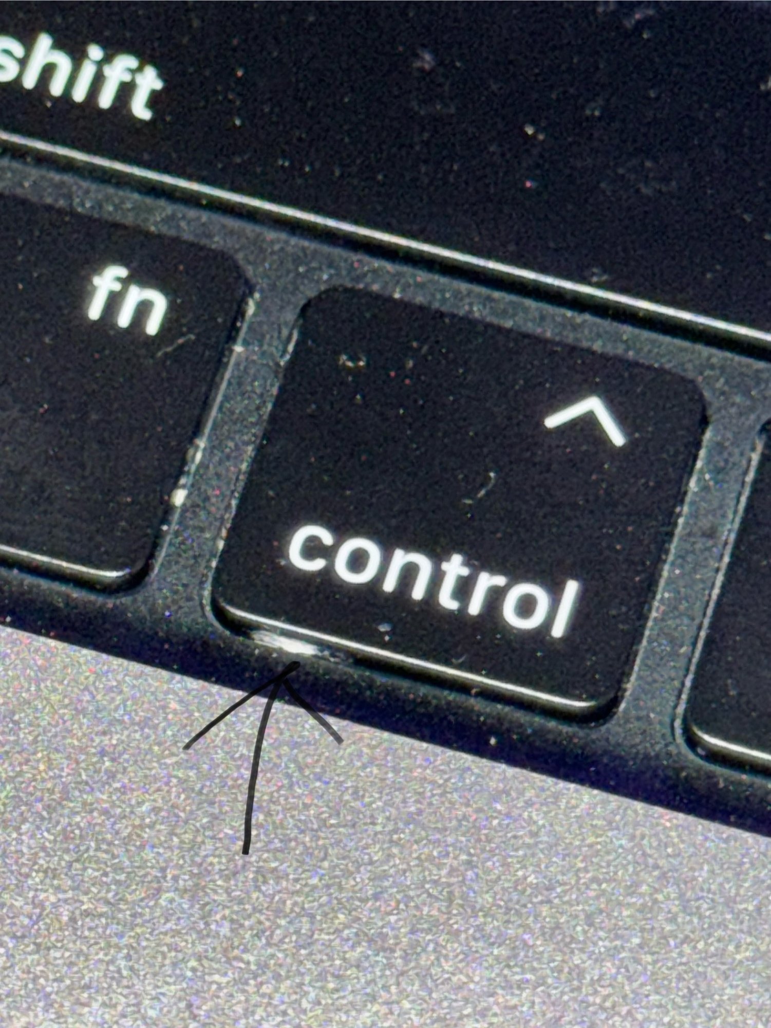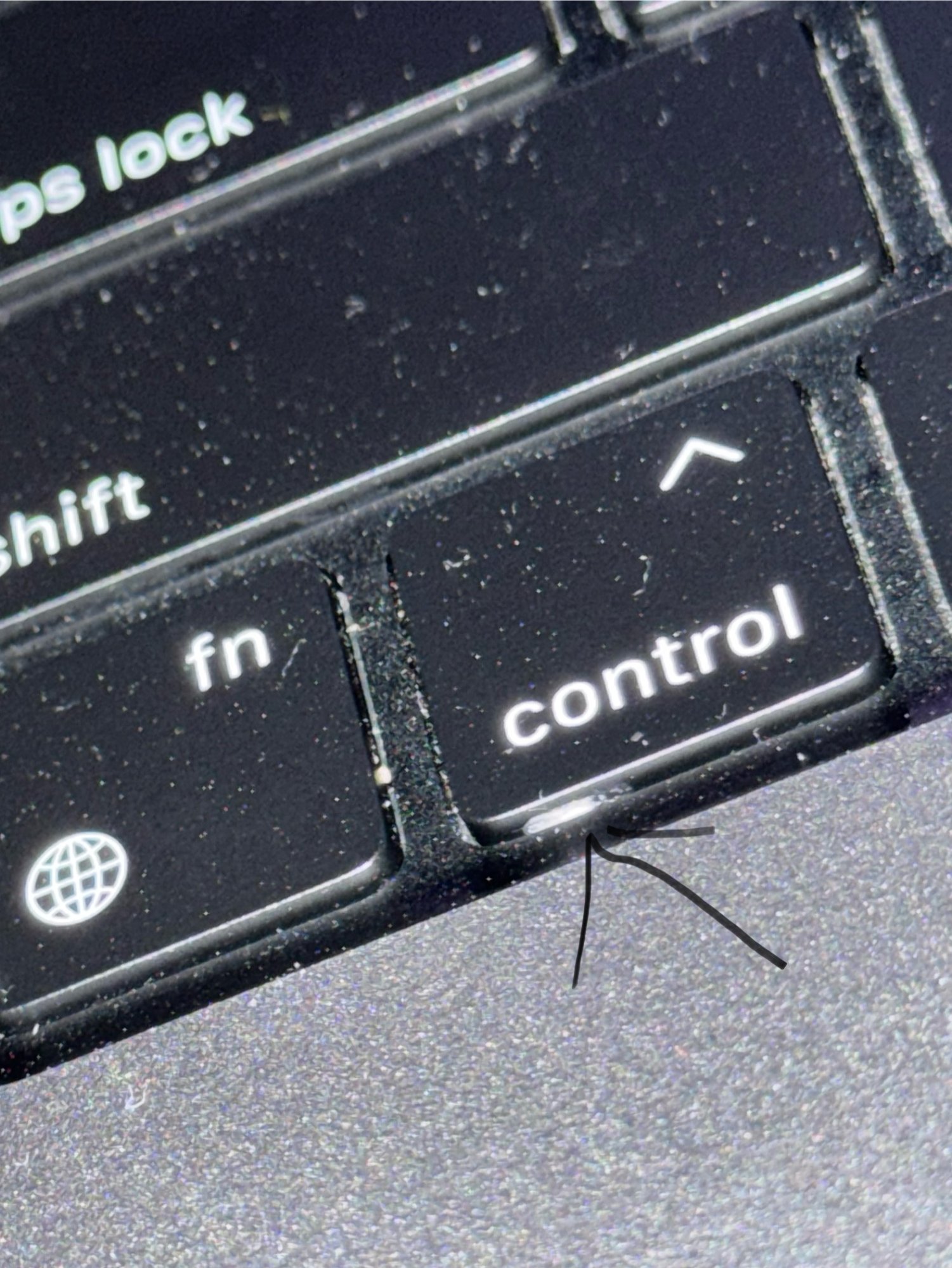 I dont even know what this is or how it got stuck to the side of the Control button of my 14 Inch M3 MacBook Pro like this, i tried using a thin piece of paper to try and scrub/rub it off the side of the button as its extremely narrow to get in there but its not coming off. I initially tried to vacuum that section of the keyboard thinking it was just dust stuck in there but then realized it was actually something stuck to the side of the button. Do i need to use some sort of a liquid cleaning solution to get this white stuff to dissolve from the button?