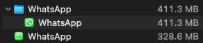 Both apps, WhatsApp Desktop and WhatsApp Messenger, appear in /Applications simply as WhatsApp. If you have both installed, one should be in a folder named ‎WhatsApp. The Desktop version is about 328MB, the Messenger is about 411MB.