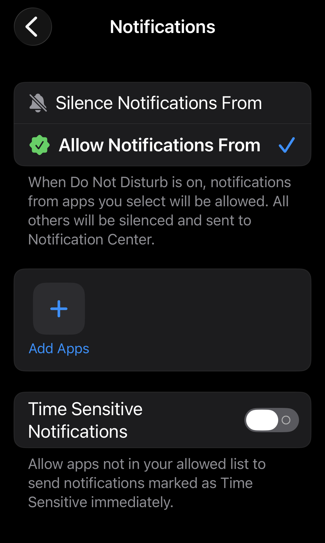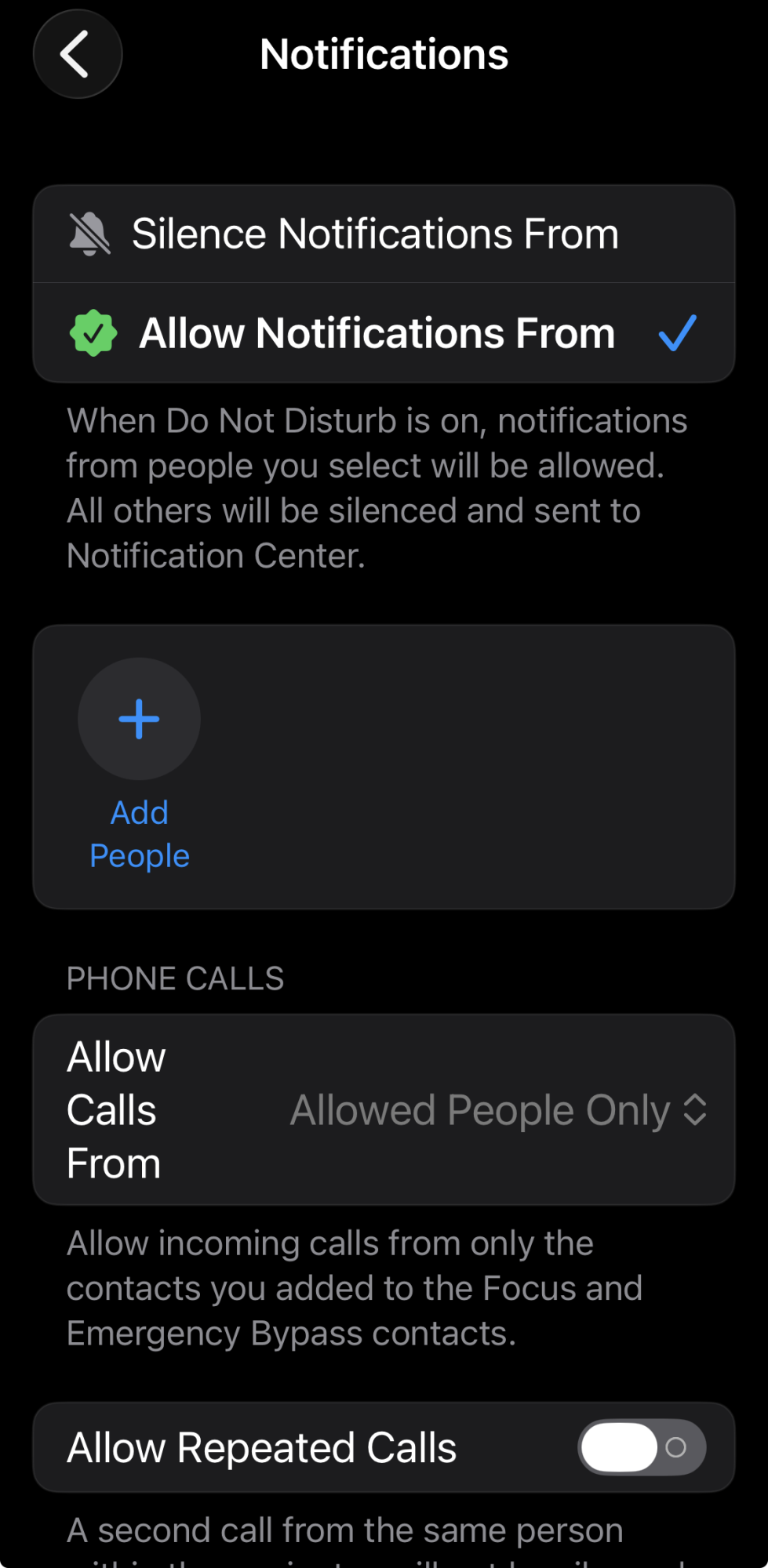 The settings in focus mode are confusing. I don’t see anything directly about phone calls. I tried to add the phone app to ‘silence notifications from,’ but is a phone call a ‘notification?’ I also set ‘allow phone calls from’ to ‘allowed people only’ (why is there no ‘allow phone calls from’ from ‘no one’ setting?). The confusing thing is that the list of people in ‘silence notifications from’ and ‘allow notifications from’ are the same. So, if add someone to the silence list, they are also automatically on the allowed list!?