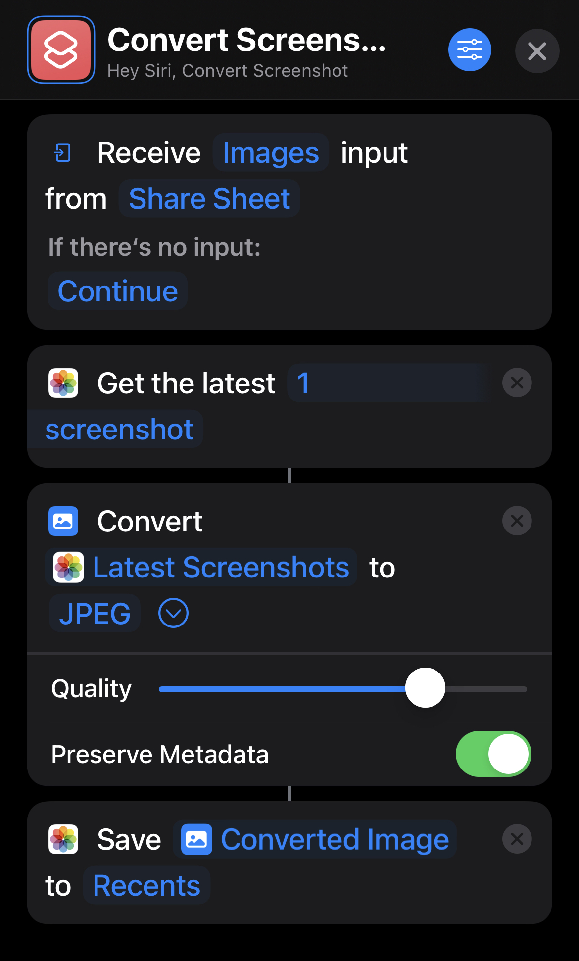 This works similar to yours. Screenshots are actually saved to the library the moment the buttons are pressed to take a screenshot. So, like you do...I take a screenshot, tap the little image in the lower-left corner to open the screenshot review/editor screen, use the share sheet to convert it, then choose to delete the (original) screenshot when I close the review/editor screen. It is a little bit hacky in that it ignores the image passed in and grabs the last screenshot instead, but I only intend to use this via the screenshot review/editor screen just after taking a screenshot. It works to keep the screenshot metadata, and I haven't had any issues with duplicates.I considered just using the "Get the latest screenshot" action, but in that case you end up with a duplicate image in your photo library unless you also add an action to delete the original; I considered it more economical to just trigger the shortcut directly from the screenshot review window so you end up with just the optimized version.