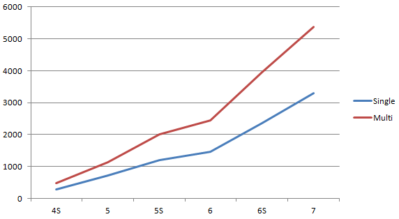 Not quite. Whilst I don't think the performance increase rate shown in that graph is exponential, or at least not steadily, exponential growth doesn't have to work in quite the extreme way you suggest. The growth rate for each iteration in your example is a huge 1000%, something Apple has never claimed, and not necessary for exponential growth.Well, I know for a fact that phones are not getting "exponentially" faster. Exponentially faster would mean you start off with say, Iphone 1 @ 20Mhz, then Iphone 2 @ 200 Mhz and Iphone 3 @ 2 Ghz. That's not true.