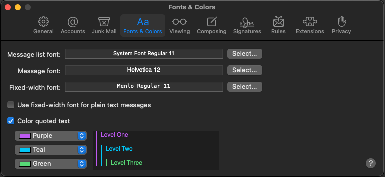 I can not find this option in System Preferences?I'm a bit confused by your question, sorry. Are you asking about the standard Mail app on the Macintosh? If so, there's a Fonts and Colors setting in the preferences.