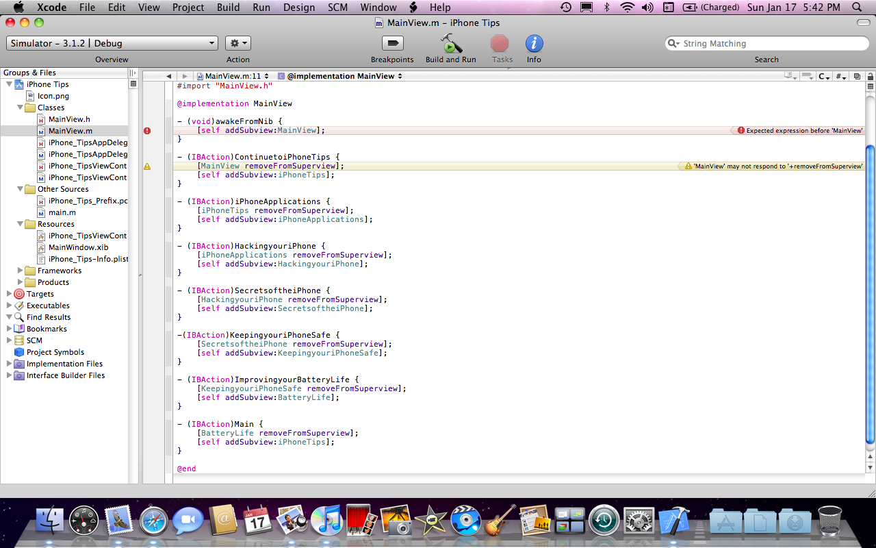 here is the code for MainView.m, can someone just quote me and put in red the thing that fixes it. thank you so much!