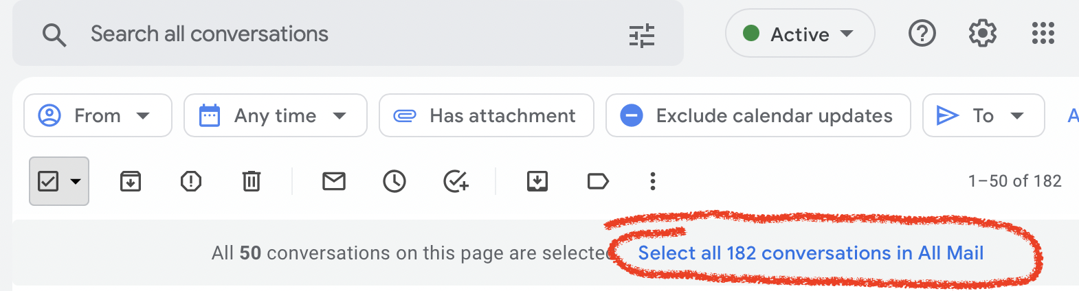 I don’t see that optionNeed more info. I'm guessing the "50 at a time" comes from Gmail because its default view gives you 50 at a time. If it is Gmail, there's a "select all XXX conversations..." link that comes up once you've selected everything in that view.