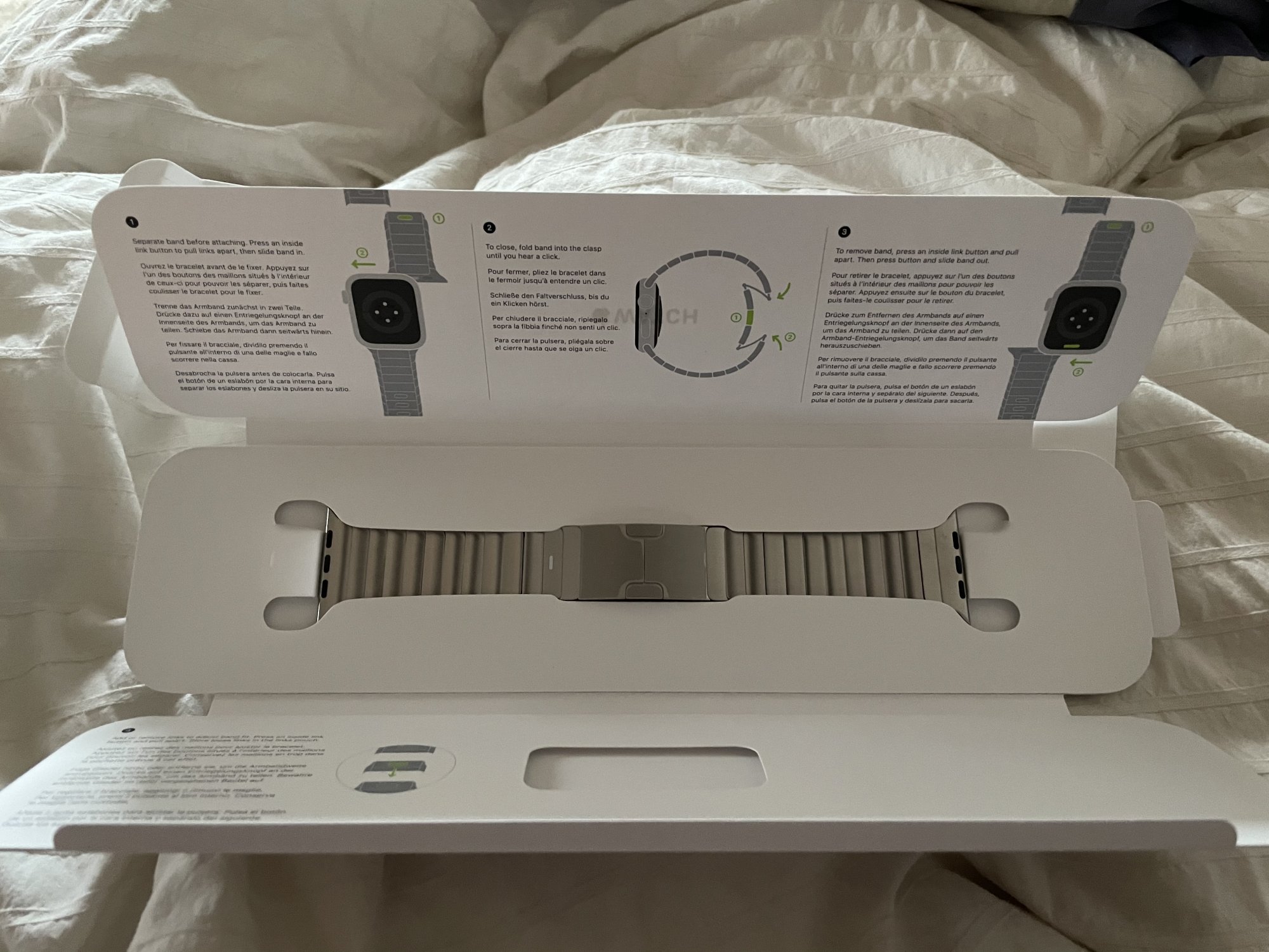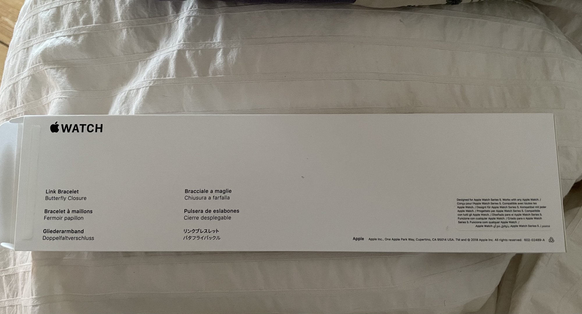 Assuming it has the correct engraving inside the clasp, it looks genuine. Apple stopped selling bands with the plastic cases sometime in 2016. If the box says compatible with AW Series 5, the band was made long after that. You can also check for the Assembled in China marking and a serial number inscribed on one of the lugs. See this thread for a more complete guide to spotting fakes.Bit of advice please!
