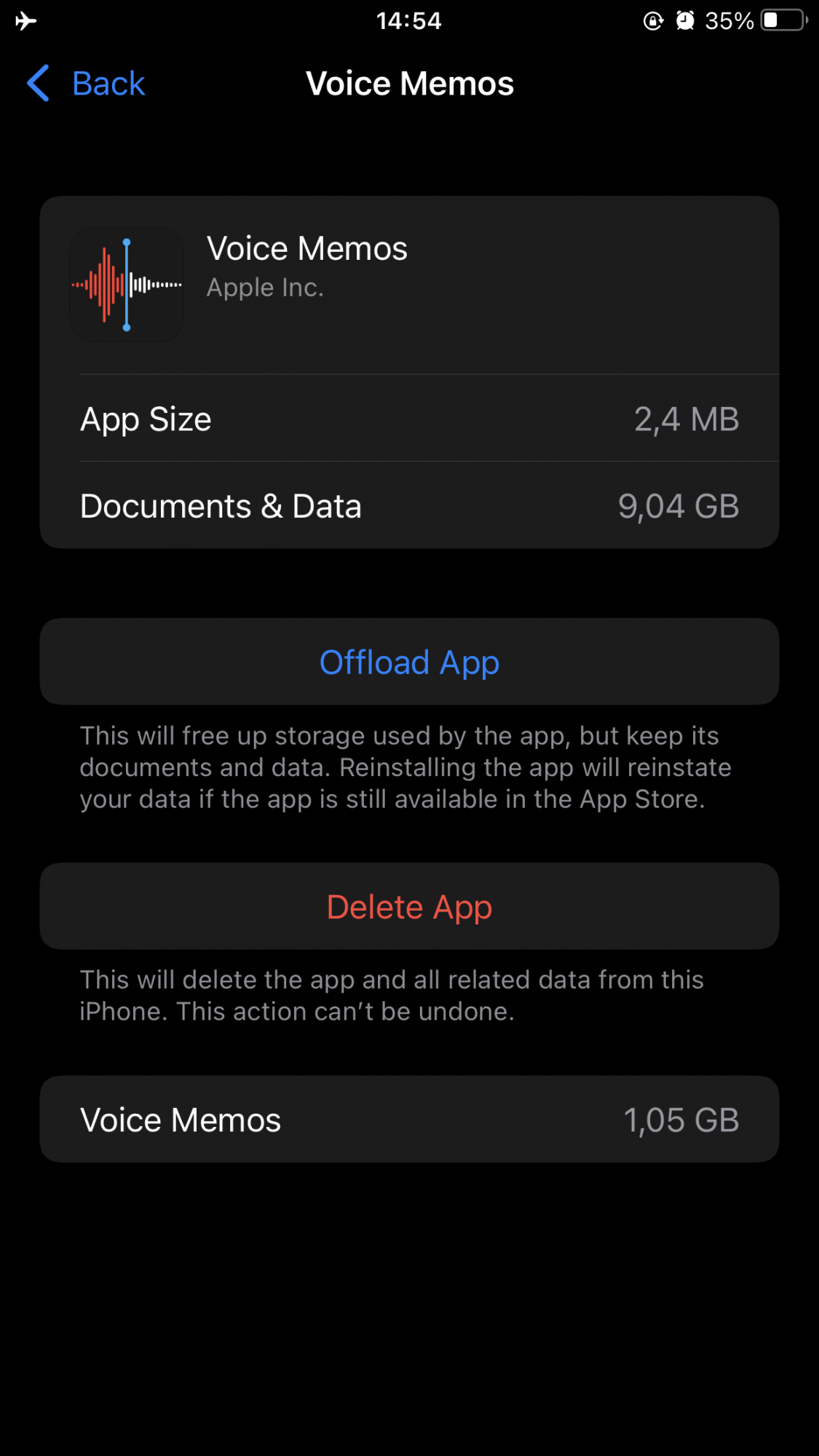 I deleted all voice memos (and emptied the ātrashā) from my iPhone, but it still was showing over 9 GB of Documents & Data!