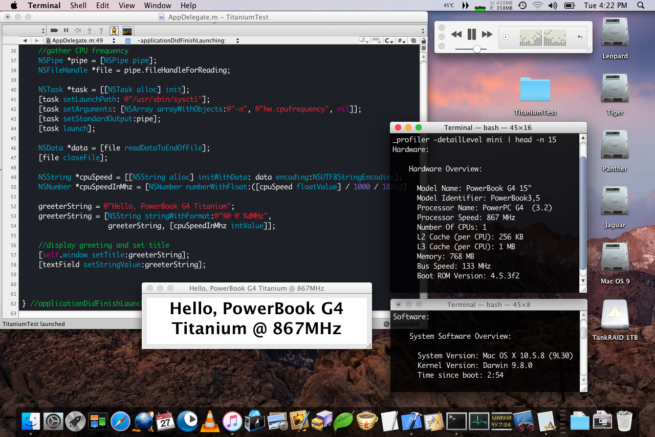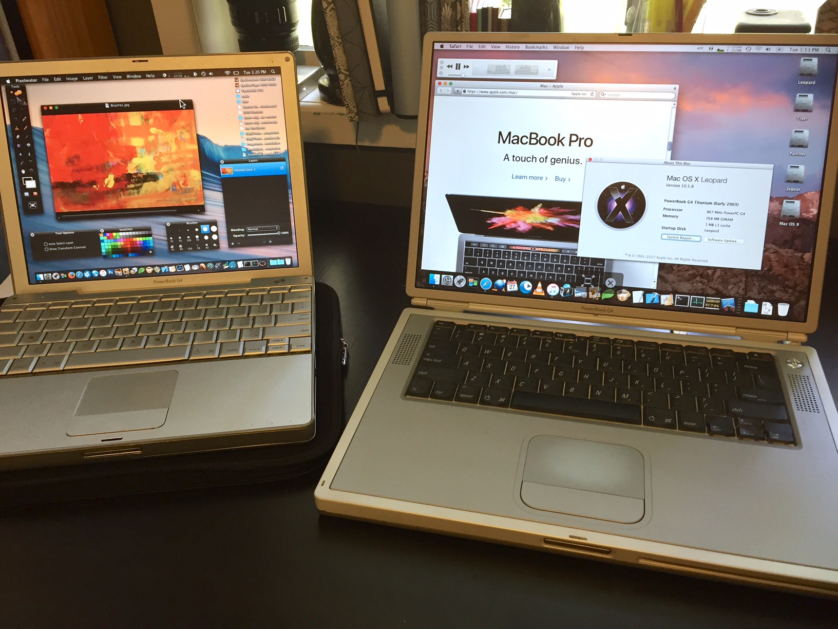 As timing has it I also got myself a Titanium 'Book (867Mhz, 768MB, 32MB VRAM) which arrived yesterday. Also in excellent condition. No paint chips, tight hinge and access door, clean, no warping and the battery appears to hold a charge. The original 40GB 4200rpm drive was noisy, so I swapped it out with an 80GB 4200rpm'er I took from my G4 mini 1.42Ghz. This drive is quiet and appears to be quite a bit faster (being 2 years it's junior). The keyboard is beautiful to type on, although there is a little lag in Leopard, Tiger and older OSes operate silky smooth.