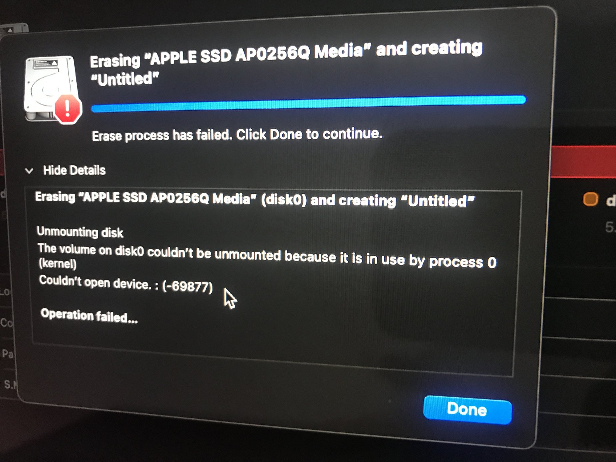 “Erase process has failed. Click Done to continue “