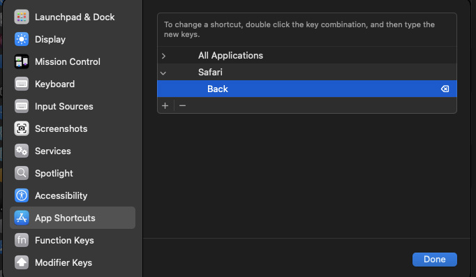 I tried changing "Backspace/Delete" to go back on Safari. It was suggested to me, so I tried it a few days ago and it worked. It did not replace the Command+[ Safari shortcut, the "Backspace/Delete" works in addition to Command+[. So I tried using "Backspace/Delete" to go back for a while and I absolutely hate it. I want to go back to "Backspace/Delete" just working on text on Safari, like normal, like it is by default.