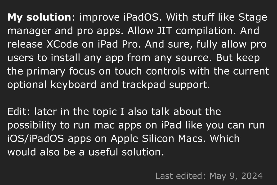 My solution: improve iPadOS. With stuff like Stage manager and pro apps. Allow JIT compilation. And release XCode on iPad Pro. And sure, fully allow pro users to install any app from any source. But keep the primary focus on touch controls with the current optional keyboard and trackpad support.
