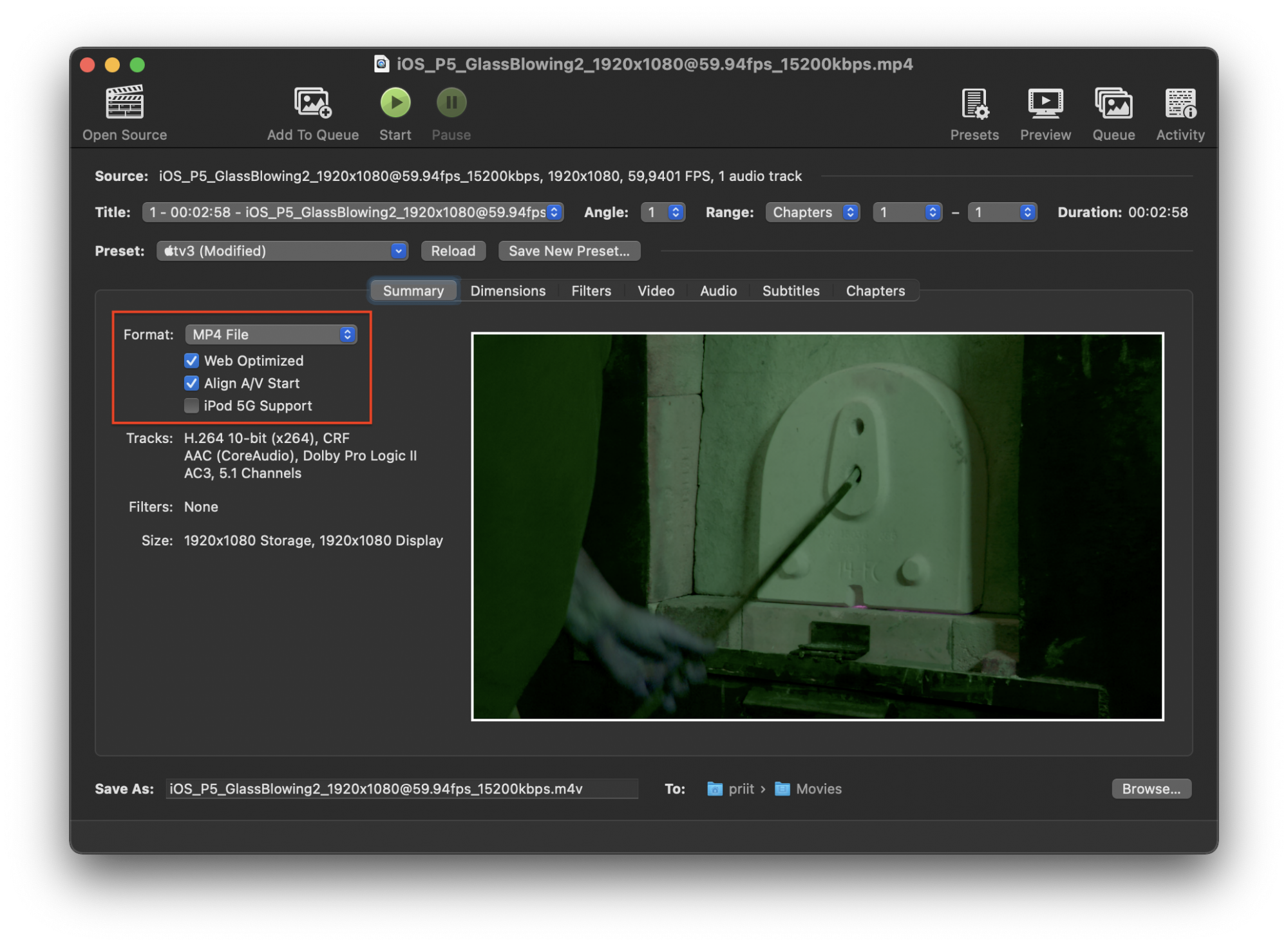 PS Make sure you have the Web Optimised option checked! It moves the essential movie info to the beginning of MP4 file, so that aTV does not need to skim through the whole file first just to get to the playback metadata (encoding, frame size, framerate etc).