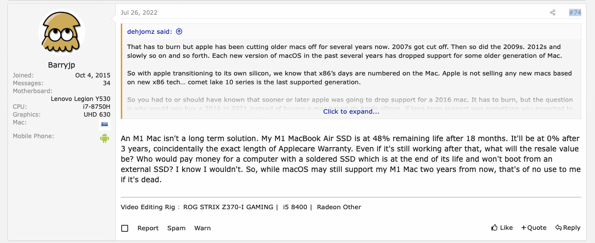 Then this clearly is an underspecced system for his use case. My M1 Mac Mini was purchased day one and has 97% life. I write 20GB a day max, often less.The following guy's 18 month old 8GB MacBook Air SSD lifespan is down to 48%.