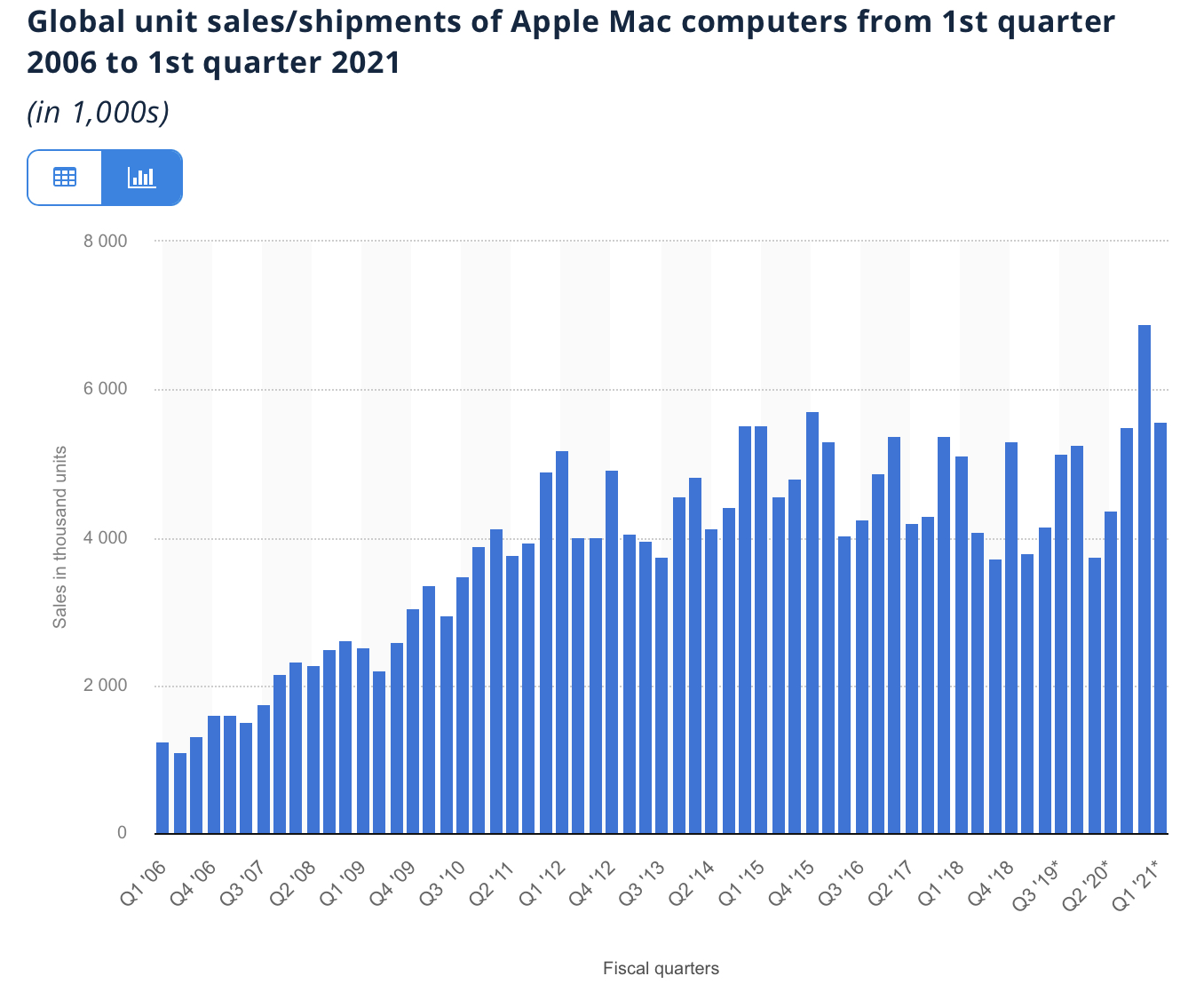 No, Mac needs ZERO GROWTH. All they need is that, for every year, a significant portion of Macs sold are to folks that have NOT owned a Mac before. They can continue to sell 20 million with 10 million going to non-Mac users indefinitely. Every year, a few million folks will need/want an upgrade keeping the sales at the same level. Once people that have never owned a Mac have no desire to buy a Mac… well first that 20 million a year drops to 10 million and just continues to drop after that.