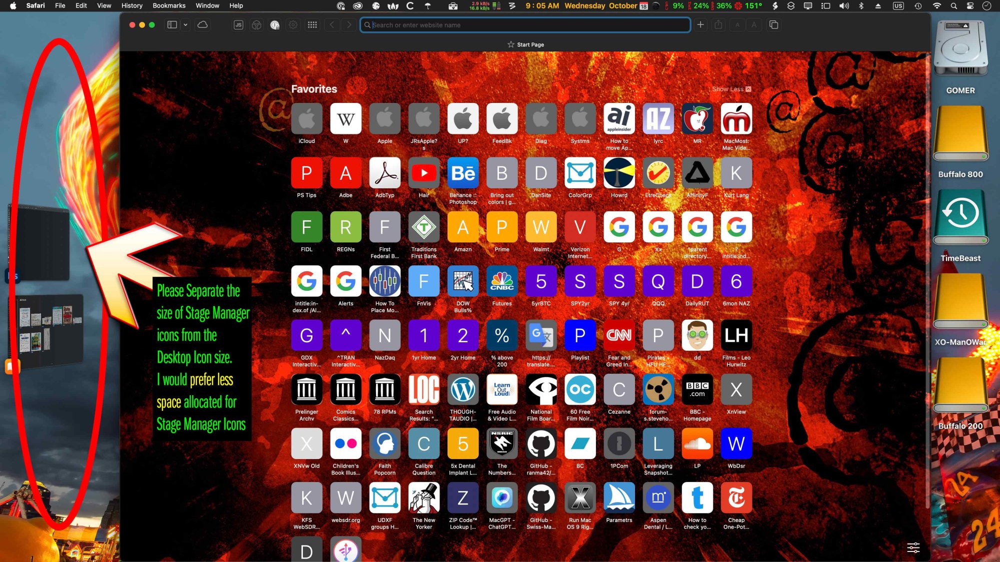 I need help from someone running the beta of Sonoma. I want to send feedback to Apple about Stage Manager. There is no place to send feedback on the Apple Support page for Sonoma system. If anyone running BETA Sonoma would help, and send my feedback. The Stage Manager Icons are tied to the desktop sized icons. I like big icons for my drives, but it's a waste of desktop in Stage Manager. I want Apple to reduce the size of Stage Manager icons without me having to make my desktop drive icons tiny. I have a screenshot to go w the feedback.