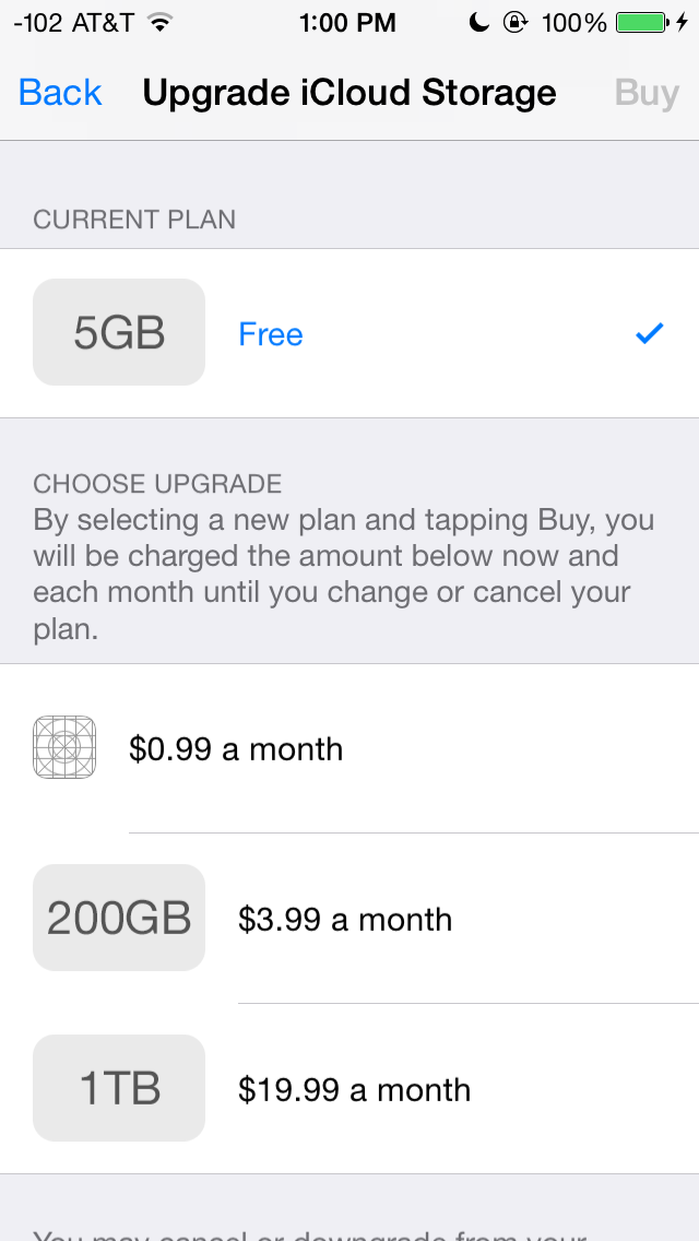 I see this too and I'm trying to go from 200GB to 50GB. 20GB was not enough but for now, 50GB is. Not bad going from $3.99 to $0.99.I know. And showing the old pricing tiers, too. Grrrr. There was a generic icon next to the 99 cent plan too - see screenshot below.