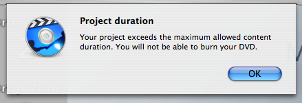 Is it possible to make a disk image longer then 2 hours on a computer that only has a regular superdrive (not a DL Superdrive)? I've tried this and idvd comes up with a message that says my project exceeds the maximum allowed content duration. and then won't let me proceed. Is there a work around for this?