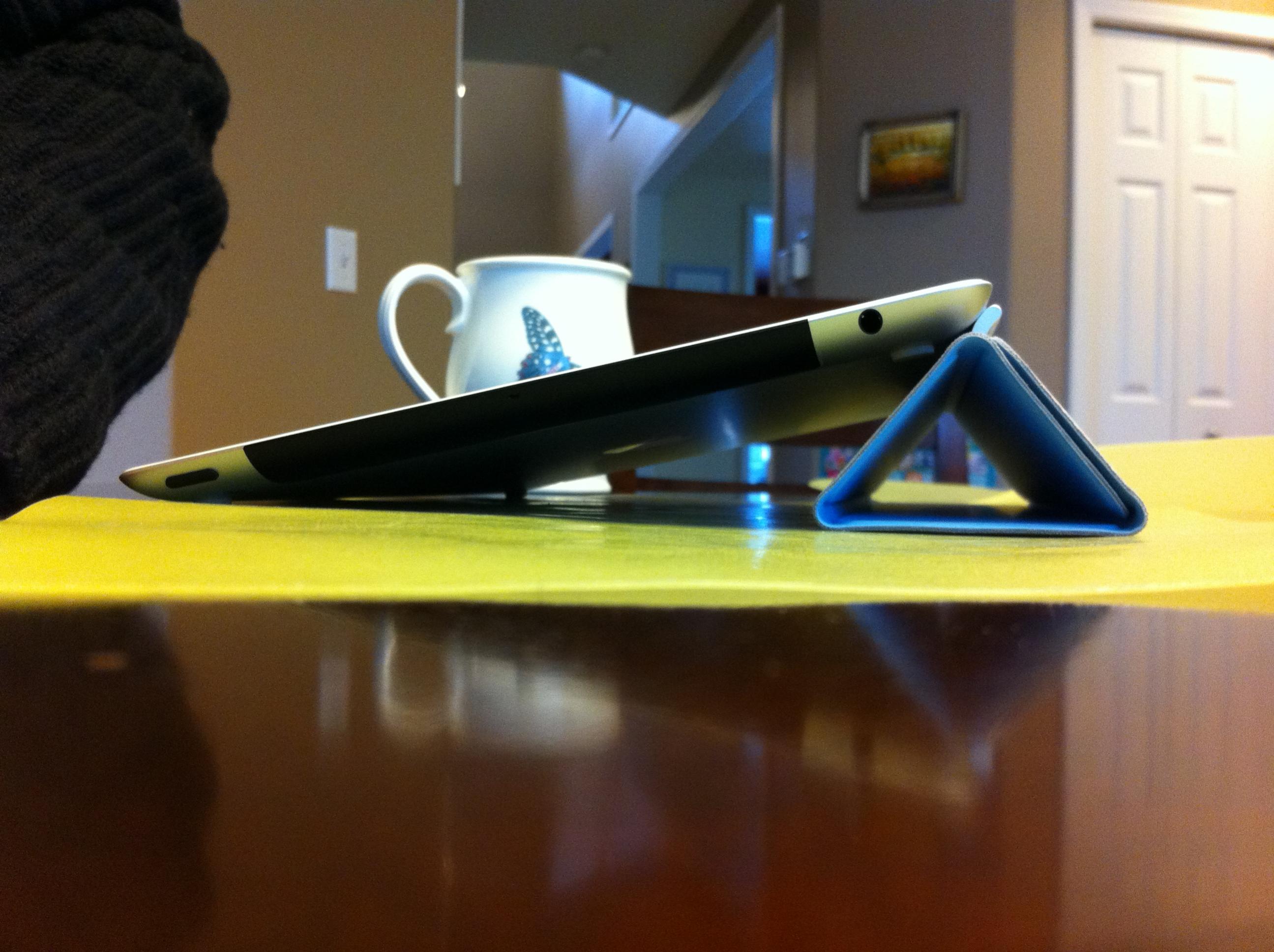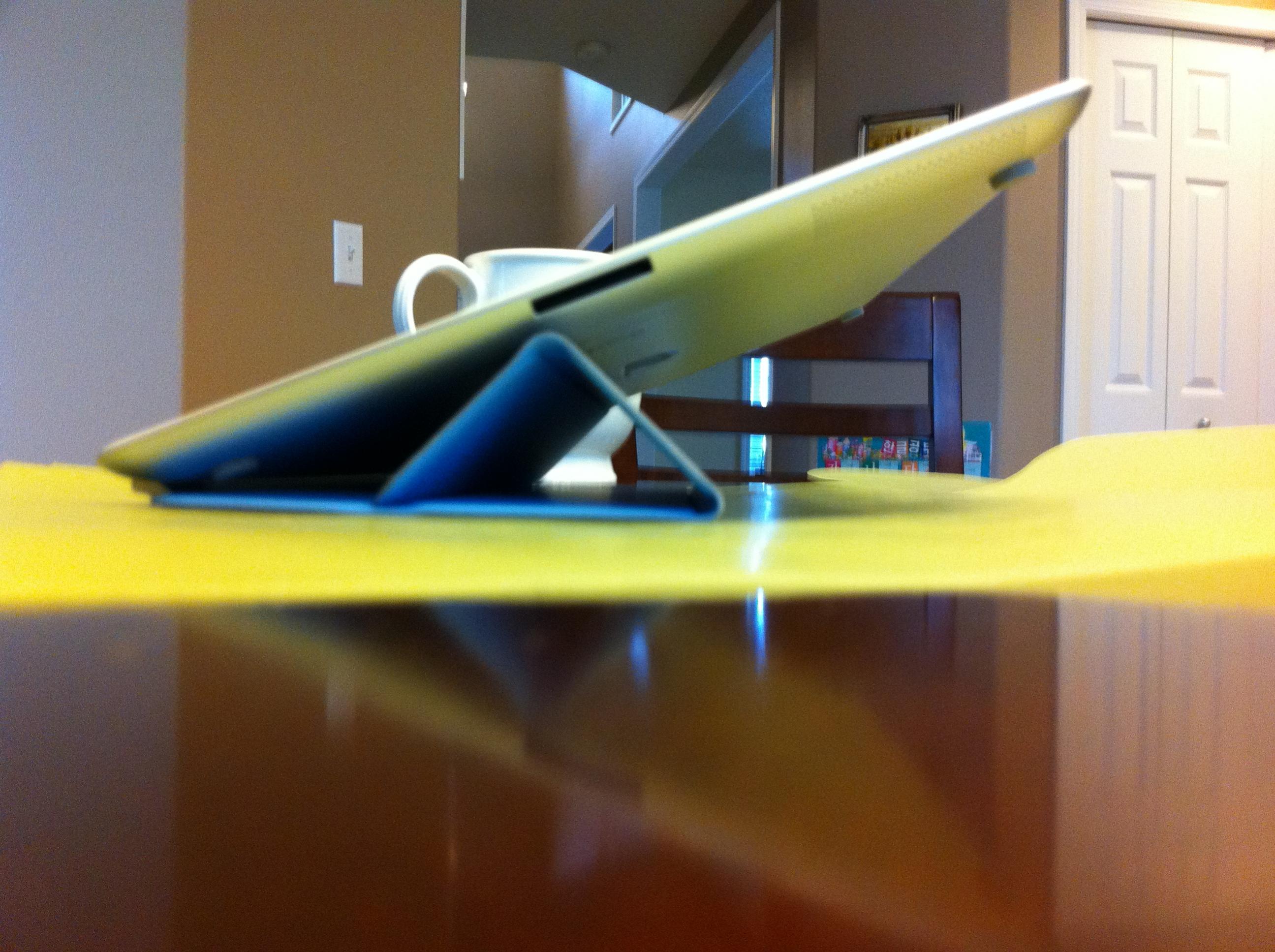 Instead of Apple's recommended way of folding the cover (i.e. creating a triangle that goes to the upper position of the iPad), it can be folded in a differently as shown in the second picture -- the edge of the cover goes to the gap between the 3rd and 4th slices. Another advantage of doing this is, the back of iPad does not have to touch the table, if you are concerned about the scratch.