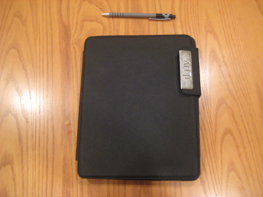The case has a clean, rugged look to it. The exterior is highlighted by a metal "iLuv" latch that has a light brush to it with embossed letters. The case closes using velcro behind the metal badge. The iPad slides in from the inner side of the binding so when the case is closed, there is no risk of the iPad sliding out. The iLuv badge is the only thing that sticks out from this otherwise subdued case.