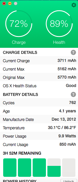 A 2% capacity improvement since last Tuesday? So I was just thinking, what is the health? Is it the battery or the overall MBP. I've never replaced the battery and maybe when I make my appointment and go in for it, I'll show the technician the battery screenshots. Is there anything else I should keep my eye on? I know that the "About my mac" is all screwed up sometimes. (The bar graph. Sometimes I can tell what's on it and other times it's all greyed out. It's stuck on "calculating" most of the time. (Like now.)) The diskspace app gives me a reading, though, According to that, I've only used 96.79 MBs out of 498.88 GB hard drive. The original one.